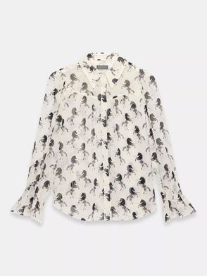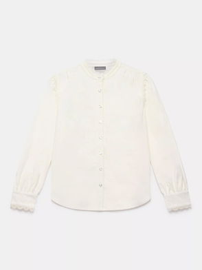 Eileen Fisher velvet blouse. Crinkled finish, band collar, dropped shoulders, button-fastening cuffs, side splits Button fastenings through front.