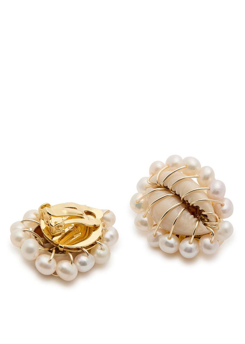 Handmade éliou 18kt gold-plated on recycled brass clip-on earrings. Cowrie seashell, freshwater pearl embellishments at twisted wire, designer-engraved back. Clip-on fastening for non-pierced ears. Presented in a designer-stamped pouch.