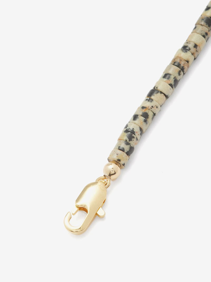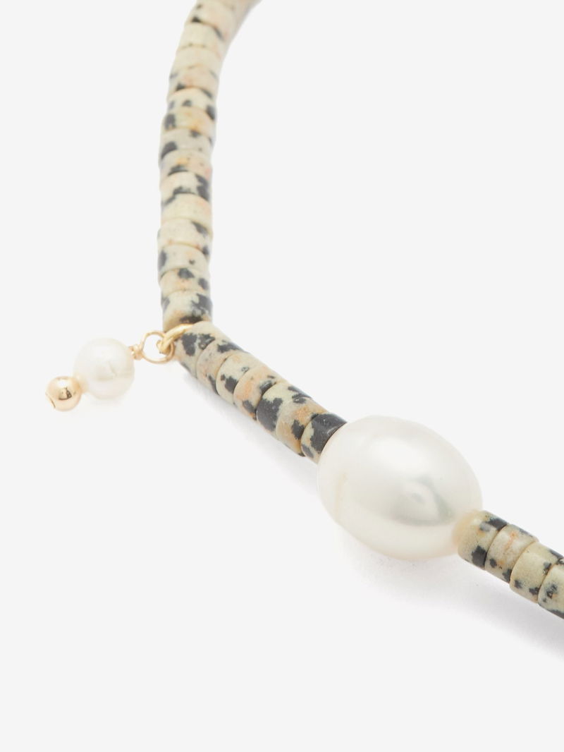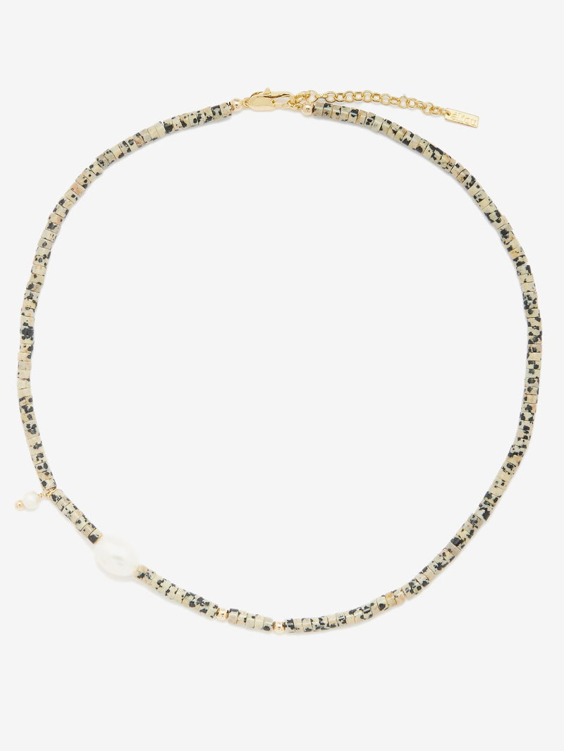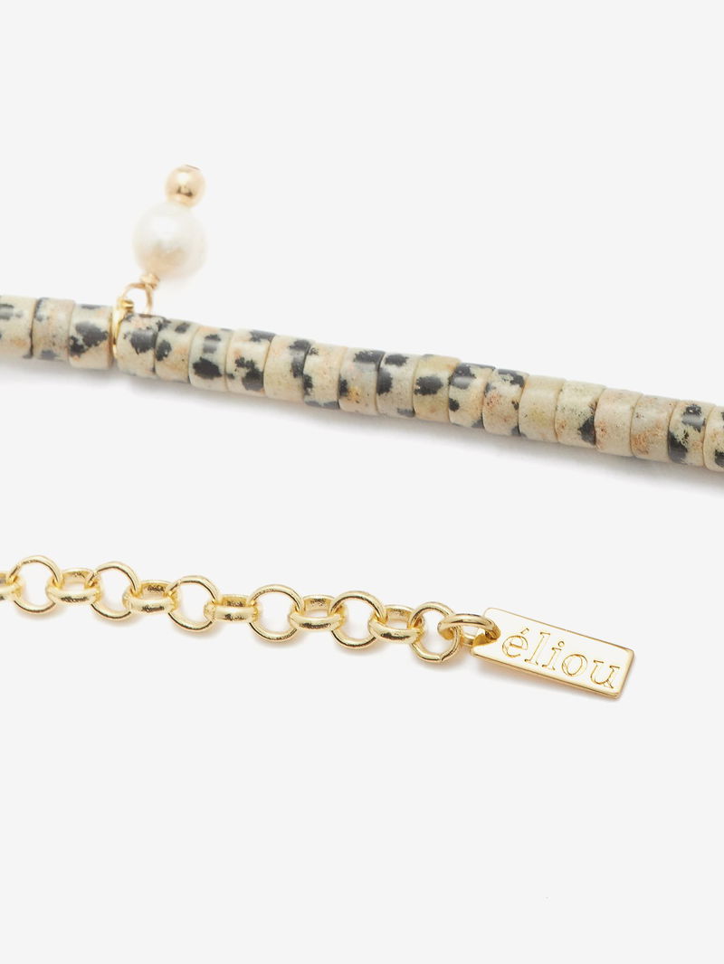 The 14kt gold-plated chain of éliou's Dex necklace is strung with pearls and Dalmatian jasper – a variety of quartz named for its black spotted inclusions.