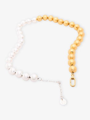 Designers and travellers Cristina Mantilla and Duda Teixeira of Eliou say they have something of a fascination with the sea and sand—well, you know what? Looking at the Mav necklace, we believe them. It’s strung with an asymmetric collection of bourgeoning freshwater pearls, while between them—and the occasional gold-tone spacer—is a rainbow of glass beads that remind us of the sun hitting the water.