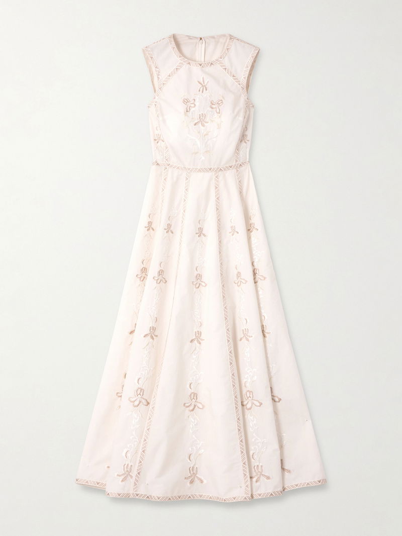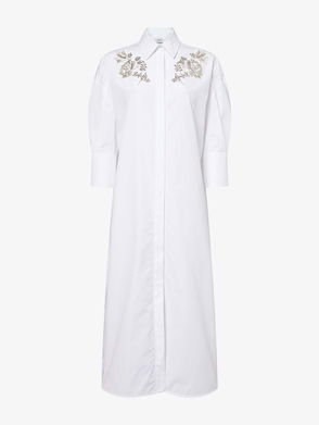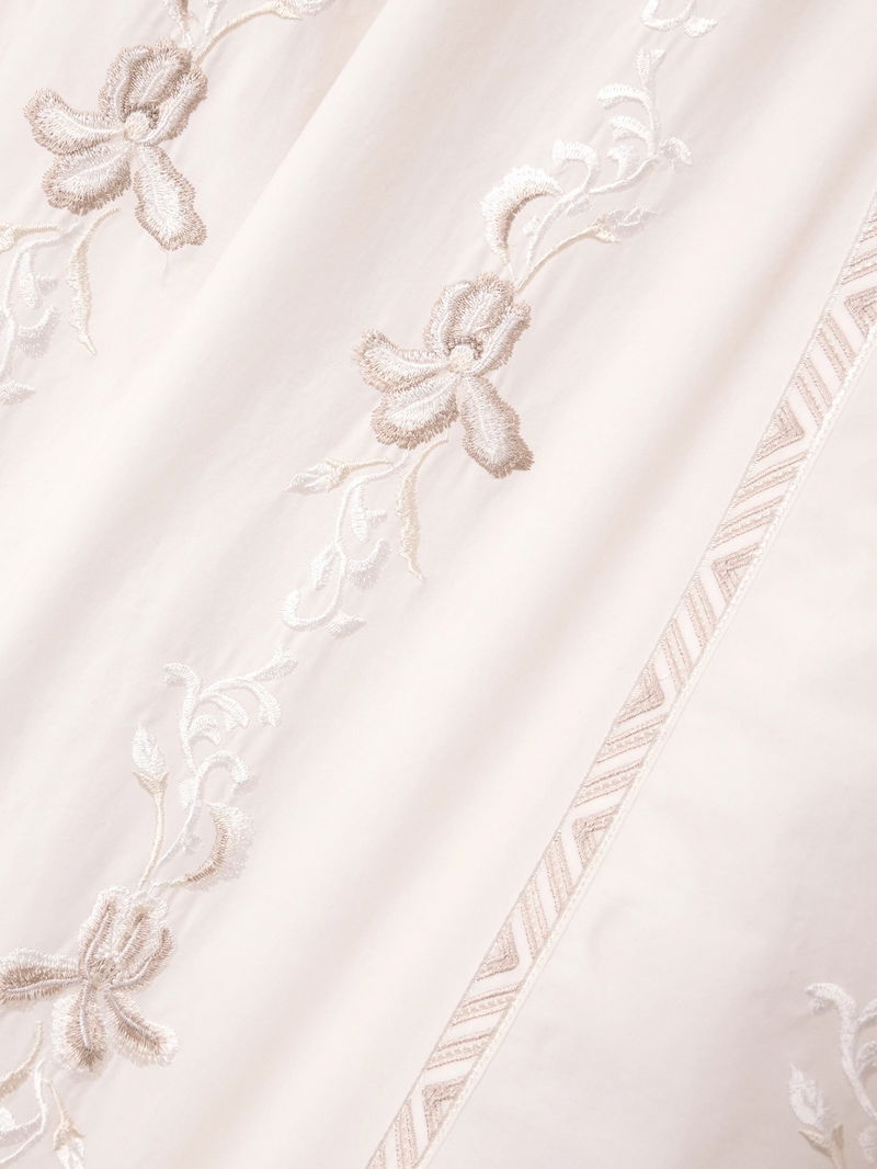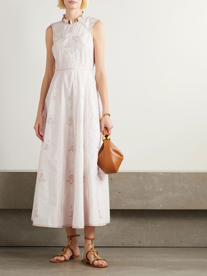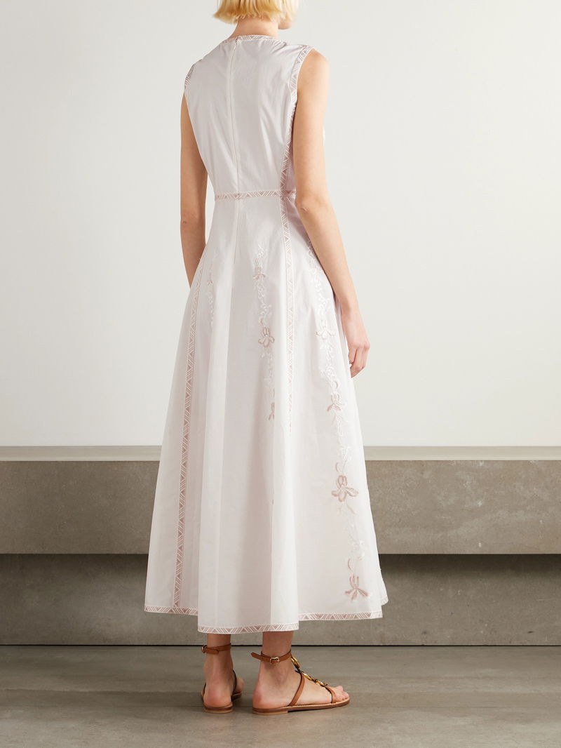 Named after the iconic Le Sirenuse Hotel in Positano, Emporio Sirenuse channels coastal elegance with the 'Clodette' midi dress. Cut from an airy cotton blend, it’s embroidered with floral motifs and finished with soft pleats at the waist and hem for a breezy, romantic silhouette.