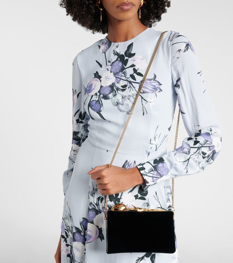 The Bloom Mini clutch from Erdem owes its name to the glamorous gold-toned hardware in a floral shape. Crafted from soft velvet, the accessory features a rigid silhouette with a suede lining and a detachable chain strap.