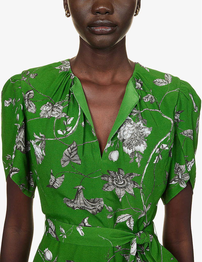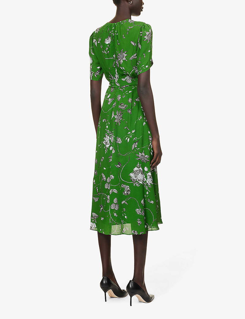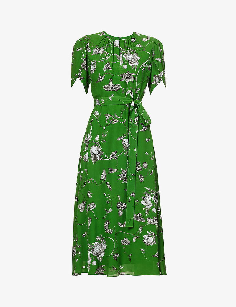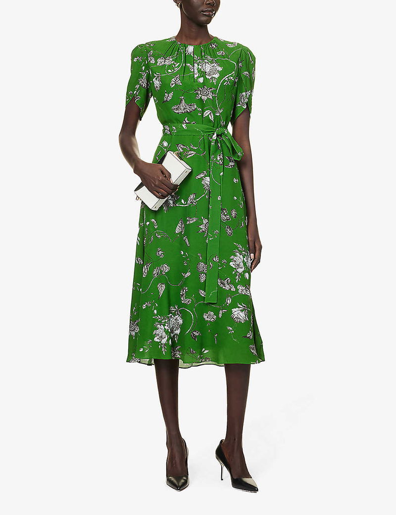 The sculptural silhouette of flowers has remained an eternal spring of reference for designers when draping the sinuous folds of fabric and crafting petal-fine fits. And, with every collection he conjures, you’ll often find Erdem Moralıoğlu wandering the garden of inspiration. Swathed in a sumptuous crepe texture, this midi dress is shaped with wing-like puffed shoulders and subtly cinches your frame with a slender belt before it’s dotted in opening blooms entwining across the flared skirt.
