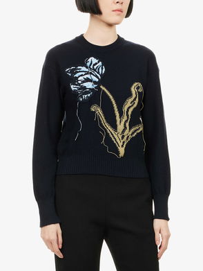 Erdem wool-blend jumper. Regular fit, crewneck, dropped shoulders, long sleeves, flower tape embroidered at front, ribbed trims, knitted design.