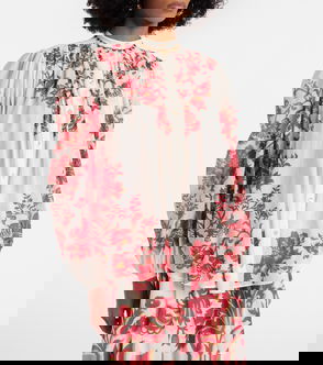 This white Theodora style is a hybrid between a T-shirt and a blouse that highlights designer Erdem Moralioglu's penchant for romantic tropes inspired by 18th-century dress. It's crafted from cotton jersey with a round neckline, then offset by puffed cream sleeves made from floral fil coupé for a characteristically poetic mood.
