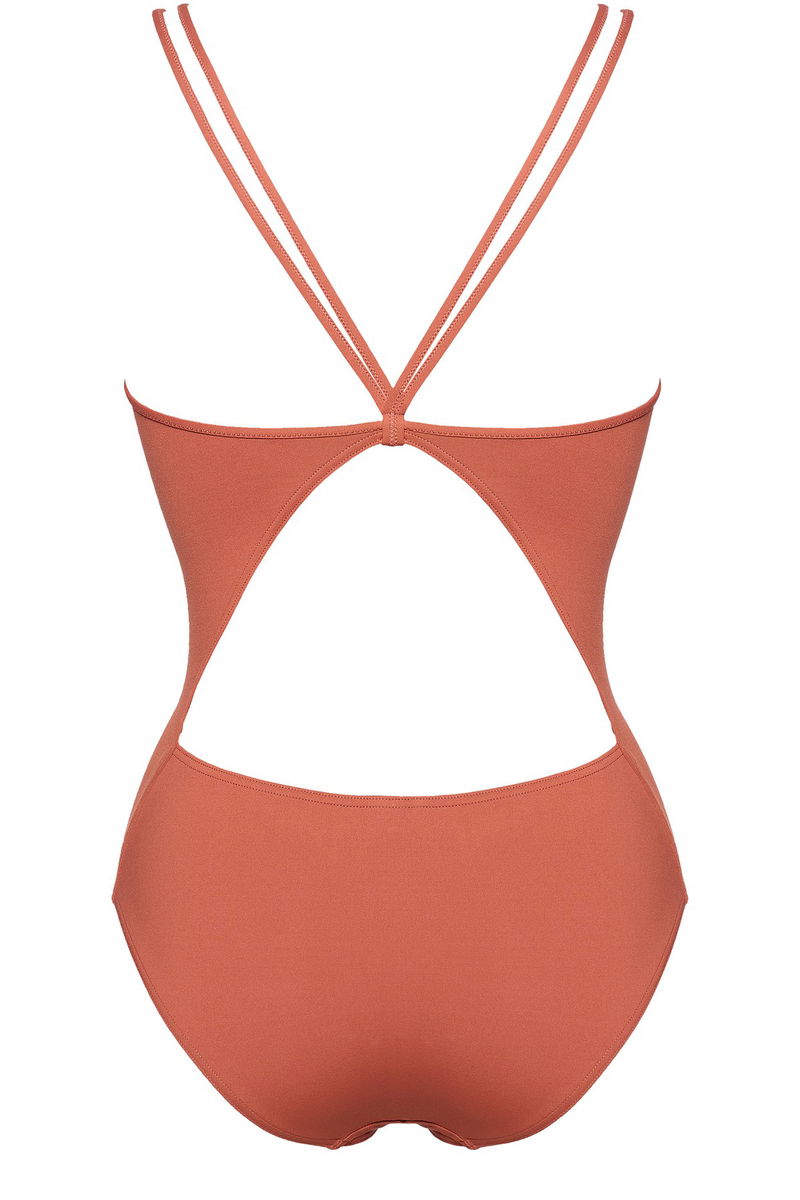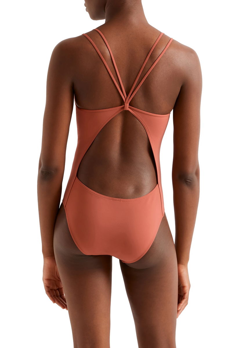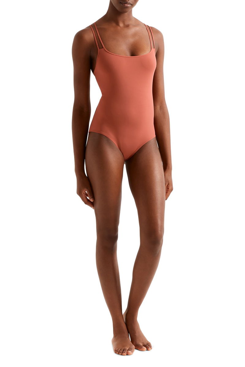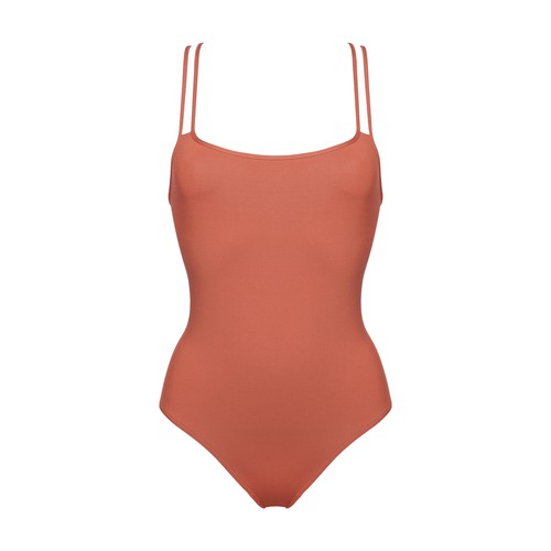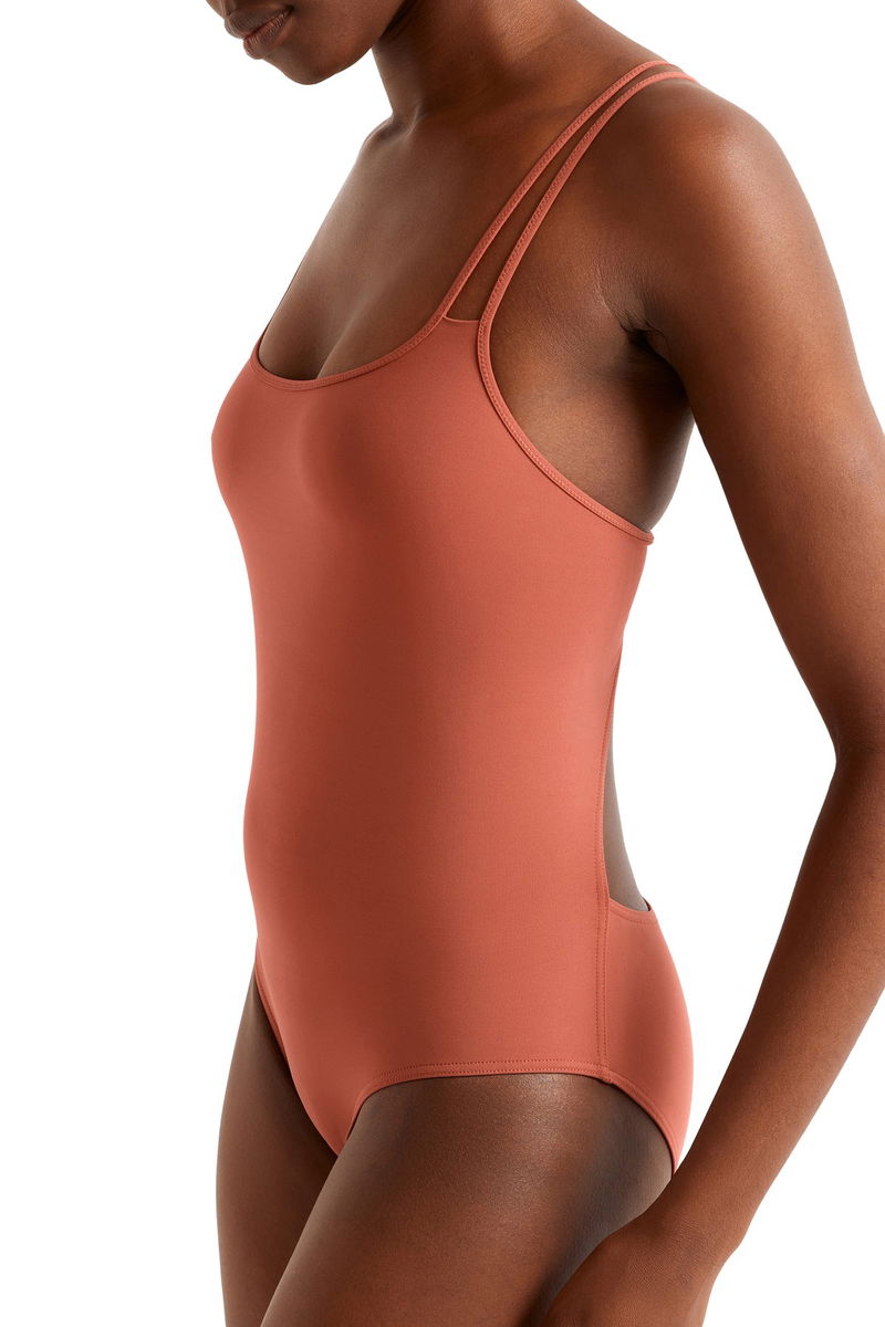 One-piece swimsuit. Stretch fabric. Thin shoulder straps. Slim fitting.