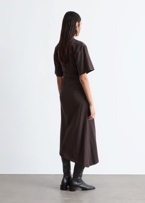 Eres' minimal 'L'Intemporel Snob' dress is cut from airy linen for a loose fit and has a V-neckline at the front and back. The rich brown color is inspired by - and named after - the shells of turtles.