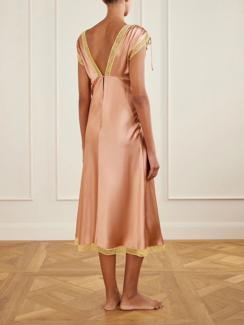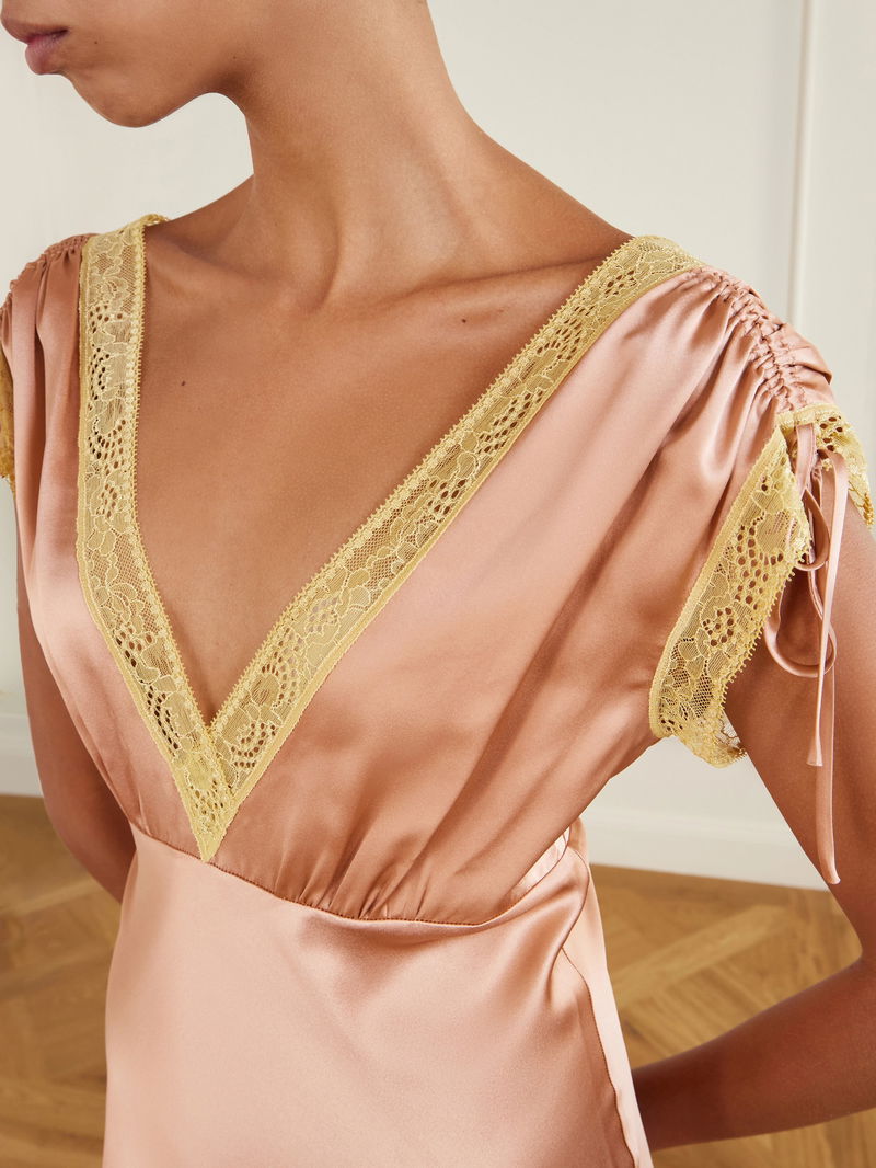 Eres' nightdress has a '30s-inspired bias-cut that contributes to its timeless appeal. Made from lustrous silk-satin, it's framed with a lace border and bares a slit at the leg. The shoulders are subtly ruched and dangle with sweet bows.
