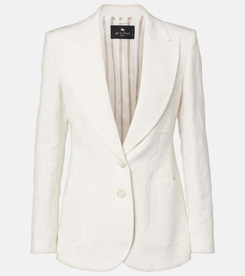 This single-breasted blazer from Etro is made in Italy from a cotton blend. The embroidered design has peak lapels and a fitted silhouette that cinches at the waist.