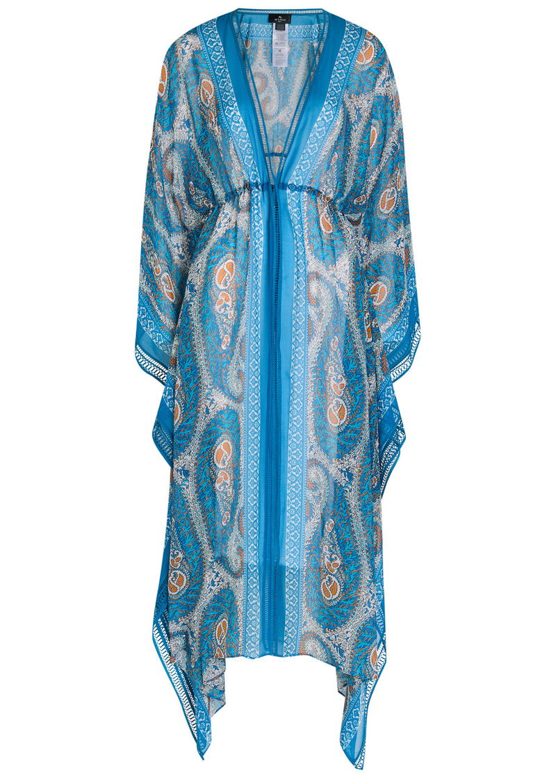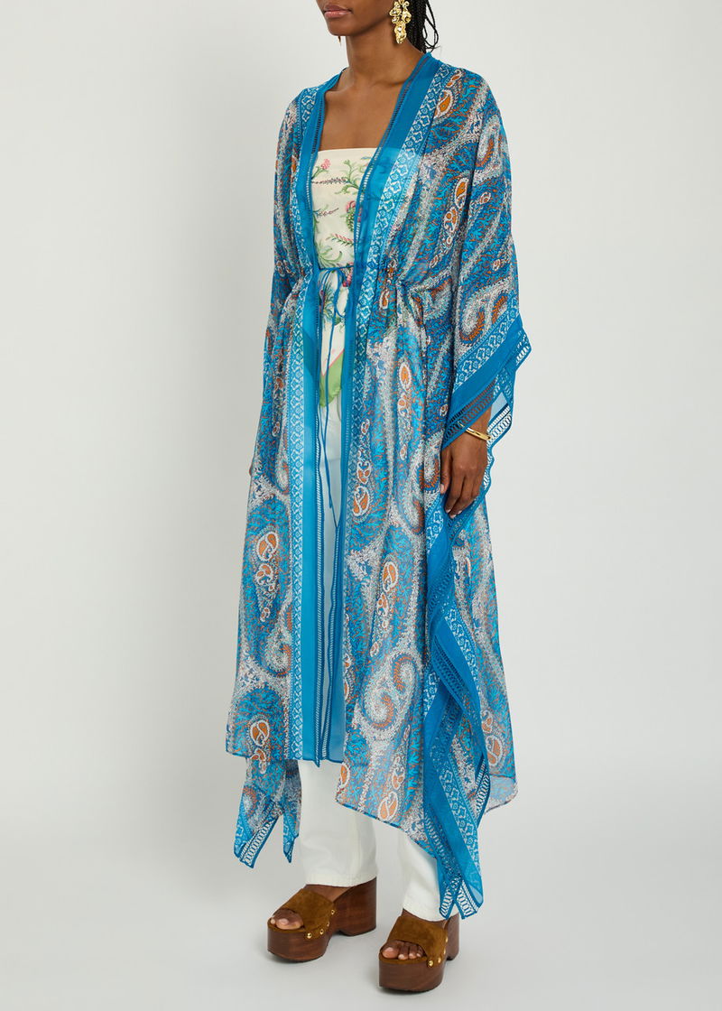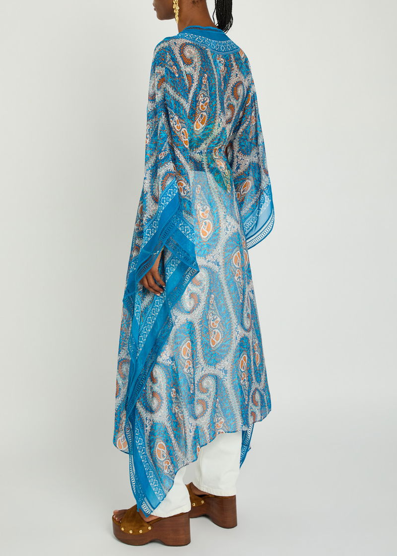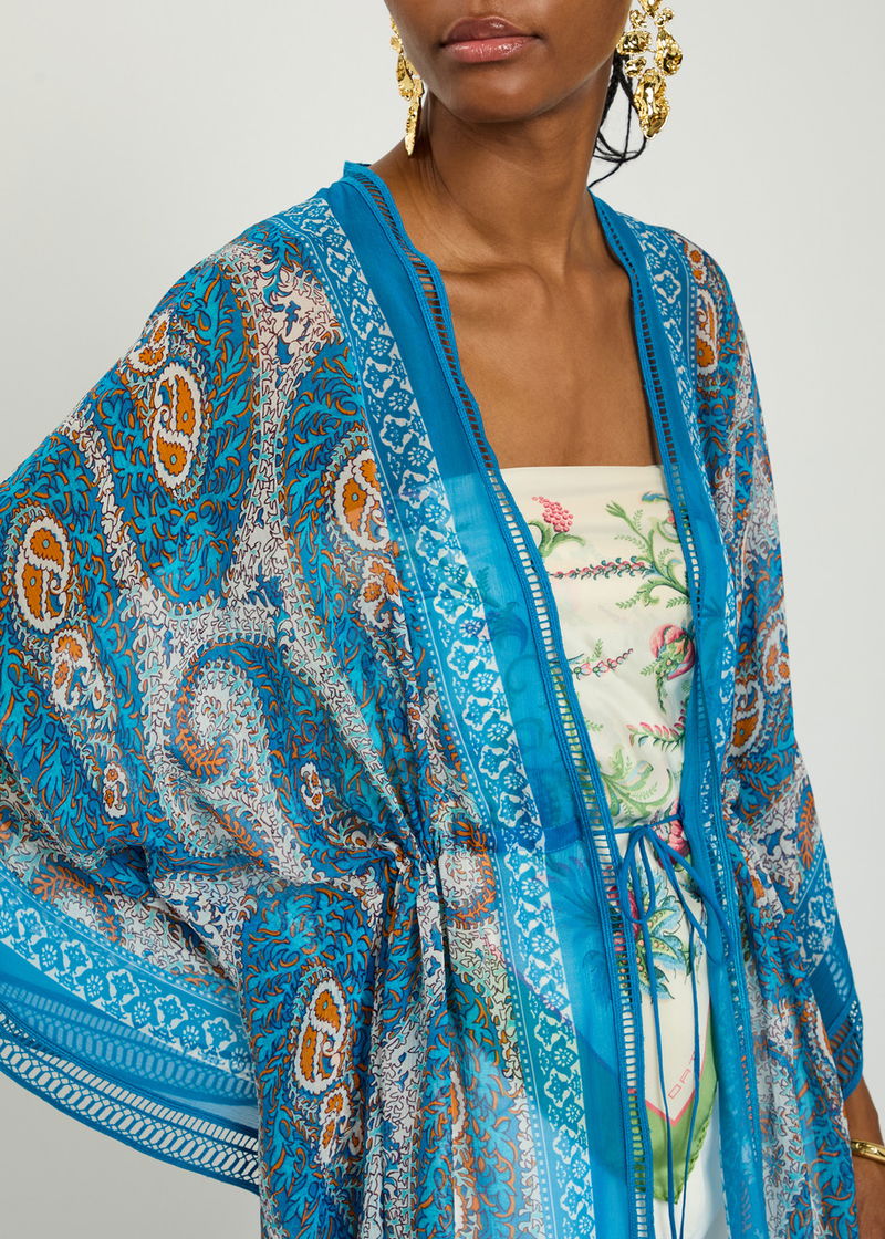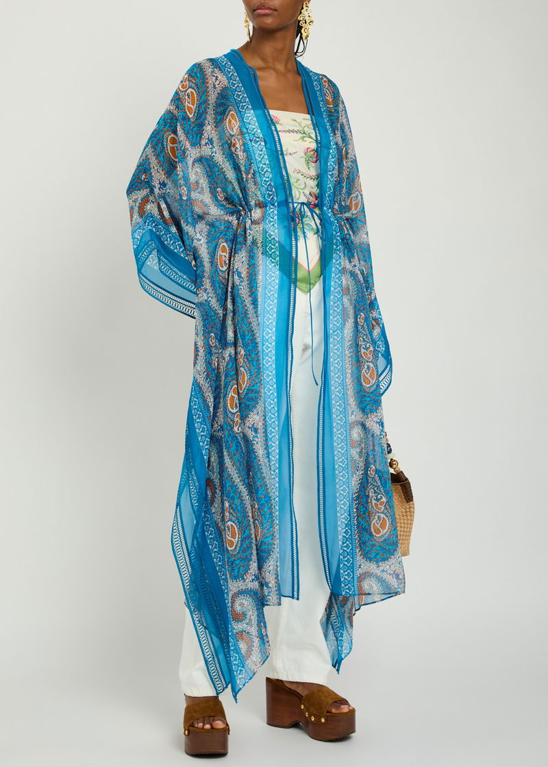 Etro chiffon kimono dress. Paisley print, embroidered trims. Tie fastenings at front.