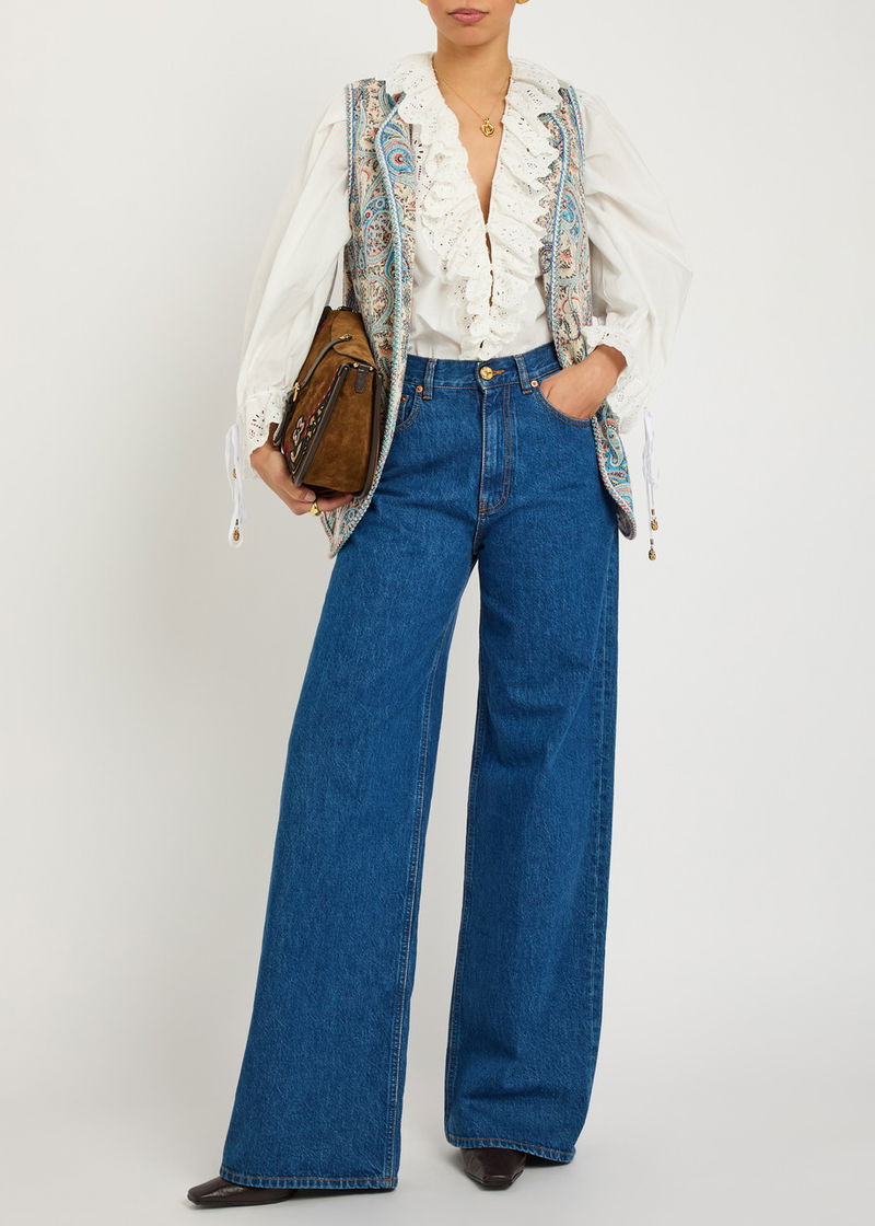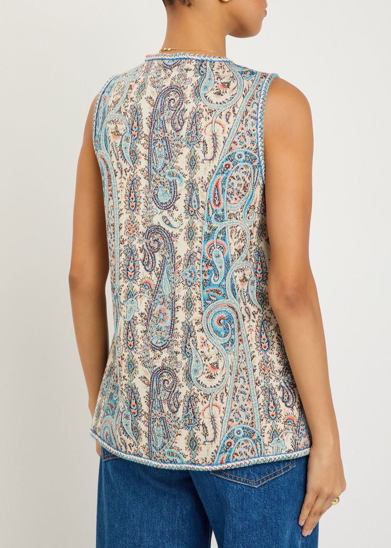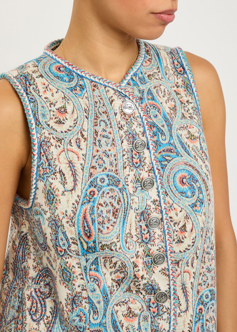 Etro cotton-blend gilet. Patterned jacquard, V-neck, two front slit pockets, curved hem, braided trims, fully lined.