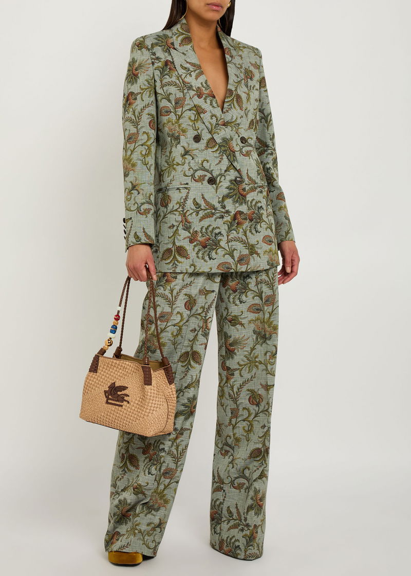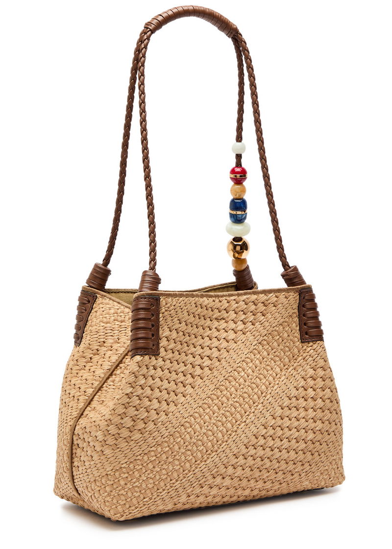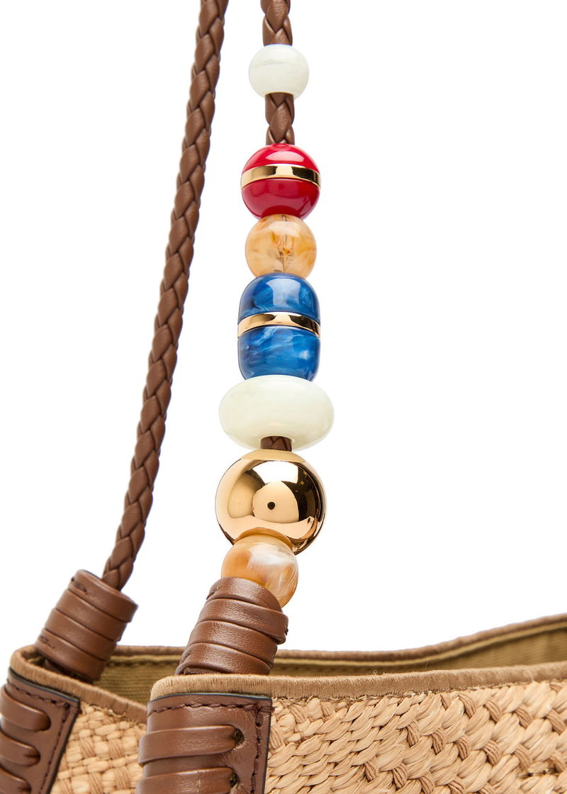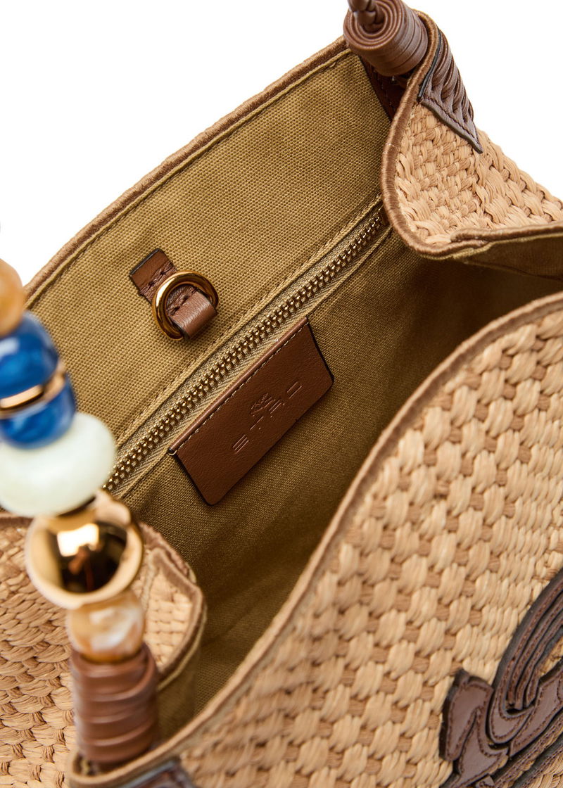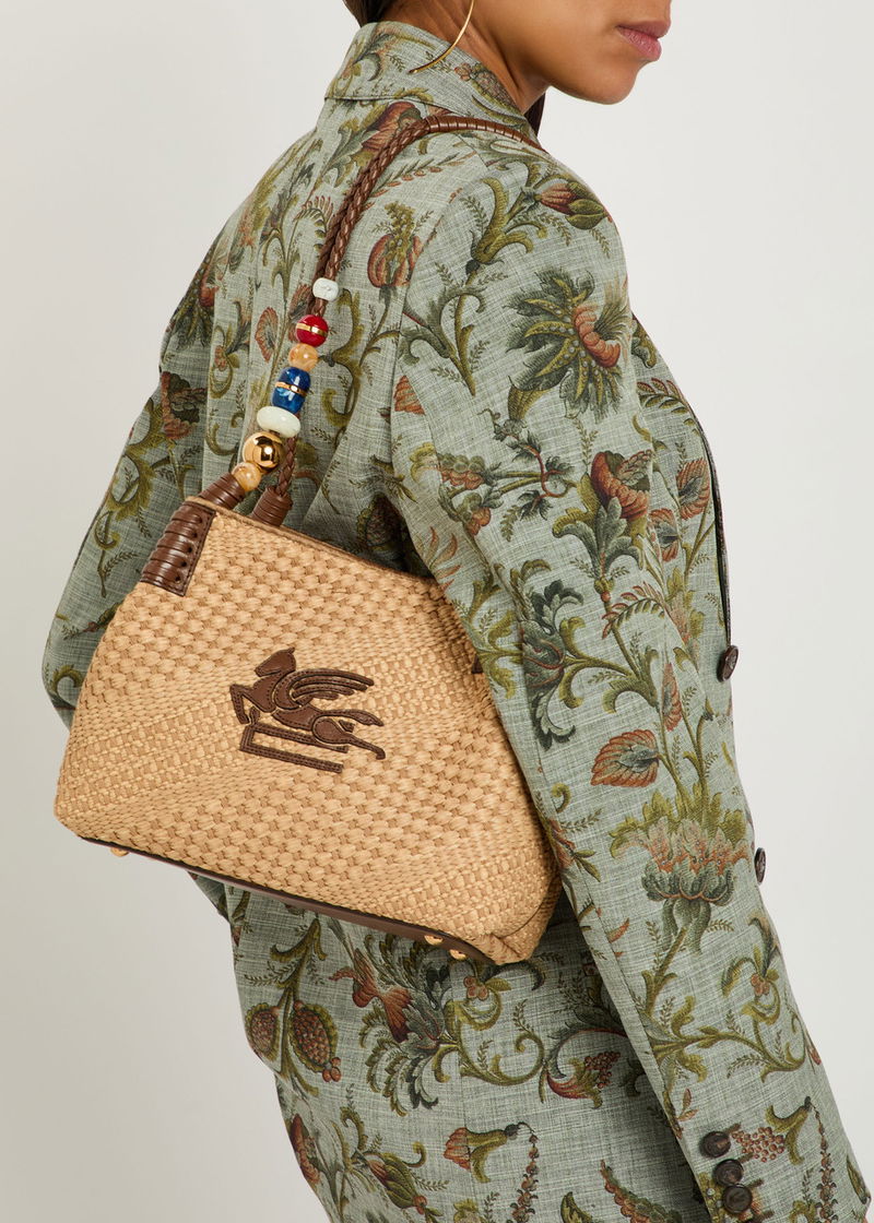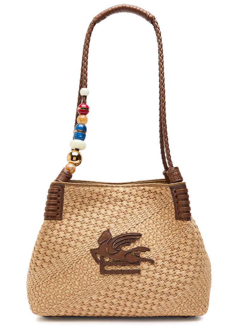 Etro raffia shoulder bag. Woven leather shoulder straps with bead embellishments, leather appliqué at front, leather base with feet, internal zip-fastening pocket, fully lined.