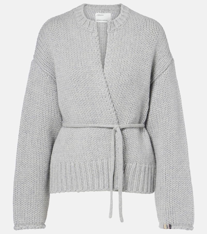 Extreme Cashmere sources its eponymous yarn from Mongolian goats known for their ultra-soft, resilient coats. The Ginza wrap cardigan is knitted from pure cashmere with a self-tie belt for a cinching effect.
