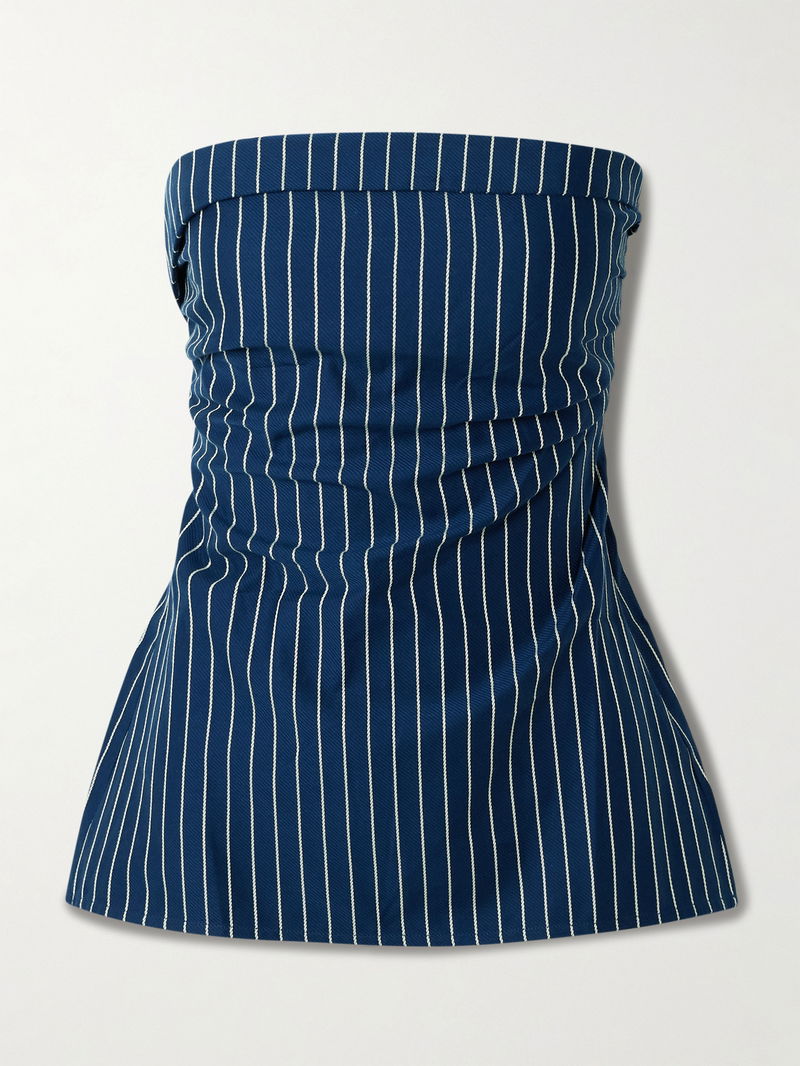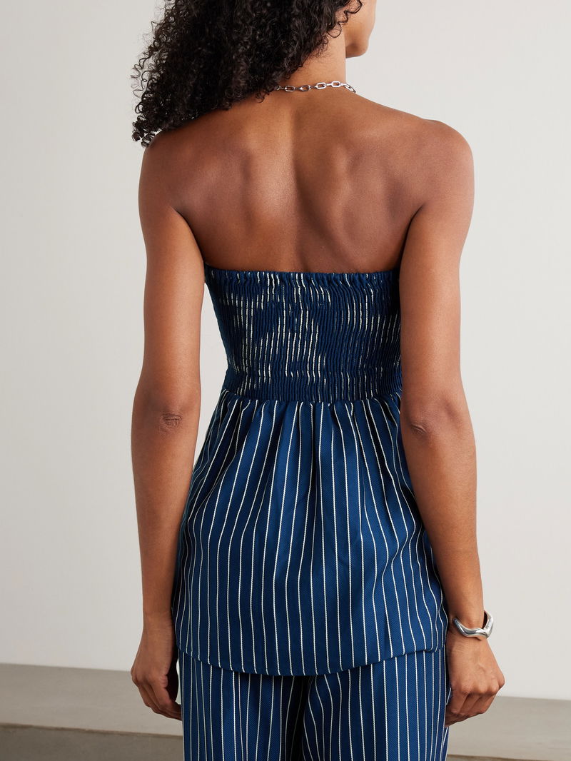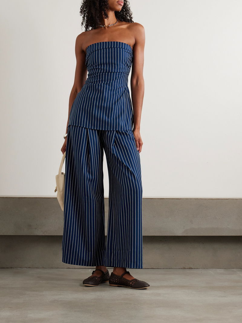 Faithfull's 'Britta' top is reminiscent of '00s styles. Made from airy cotton-twill, it has a folded, strapless neckline and is lightly gathered to emphasize the waist. The pinstripes are so sharp, especially when paired with the coordinating 'Laila' pants.