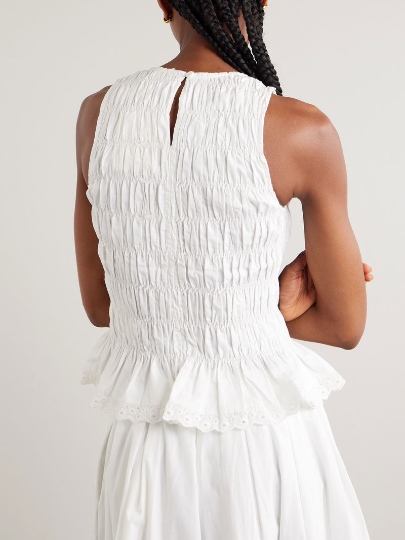 Description: Whether you're exploring a city or visiting a beach town, Faithfull's collections will ensure you do it in undeniably chic style. Cut from breathable cotton, this 'Thea' top is shirred throughout for a close fit and finished with a broderie anglaise peplum hem. Team yours with flat sandals and the matching 'Ruth' skirt.