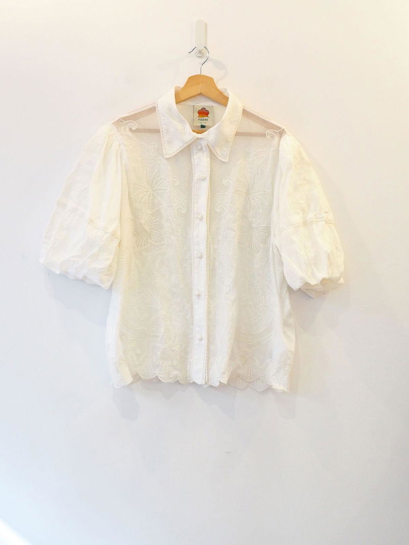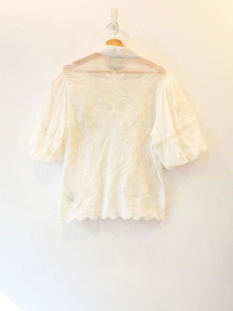 This short-sleeve shirt is made from pure cotton with intricate embroideries and a buttoned front.
