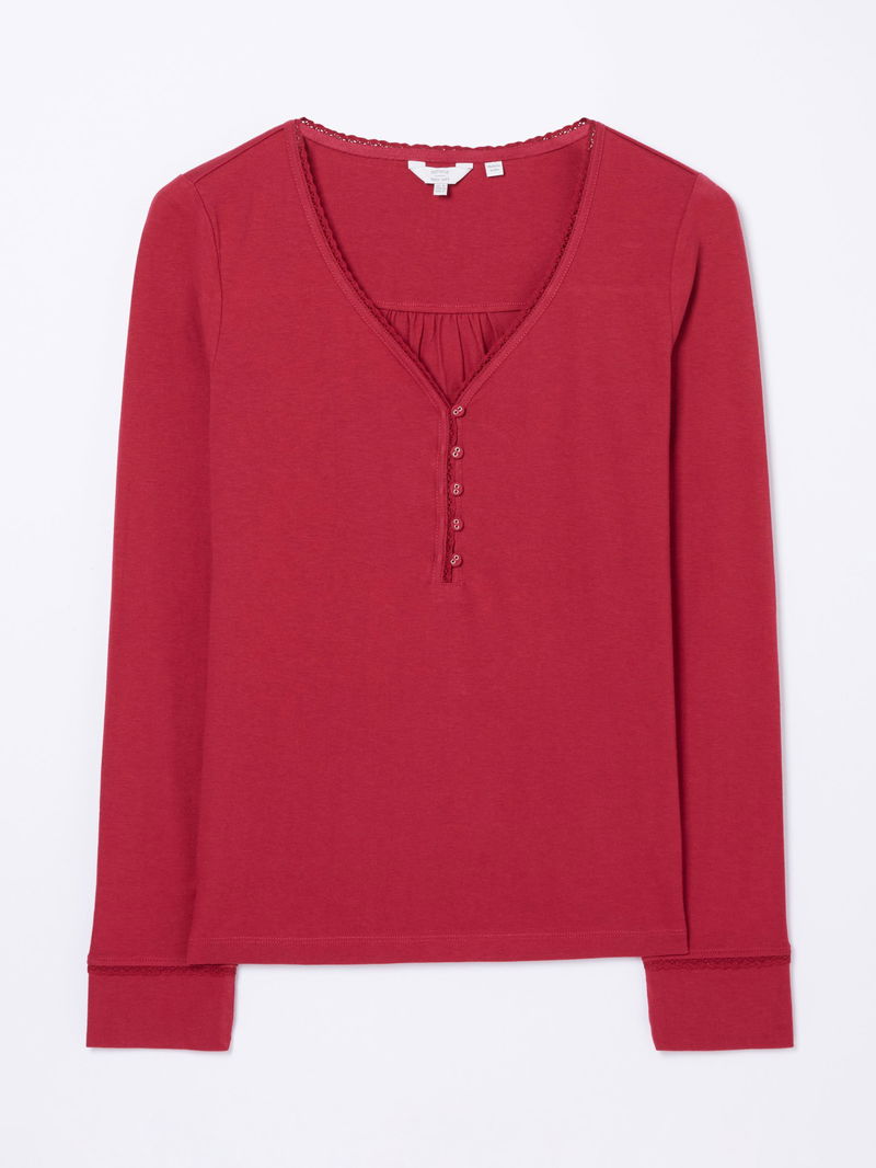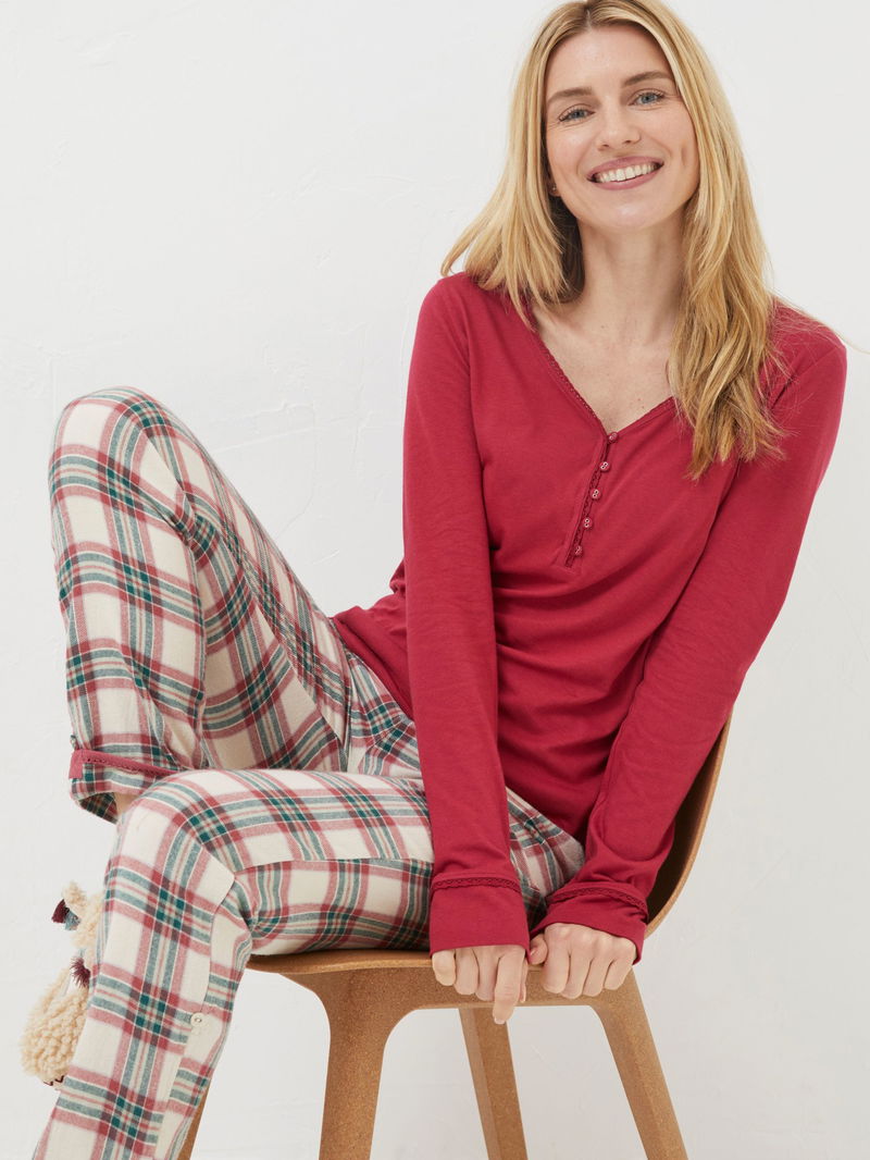 Crafted from a super soft cotton blend, the Livvy top is perfect for slow weekends and lounging in. With a pretty lace trim and button detail, she's cute, comfy and versatile. Style with your go-to printed pj trousers or cosy joggers.