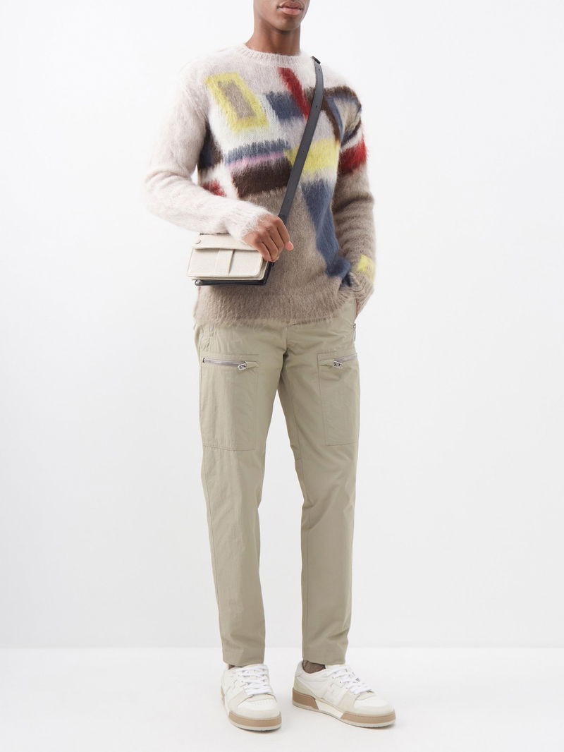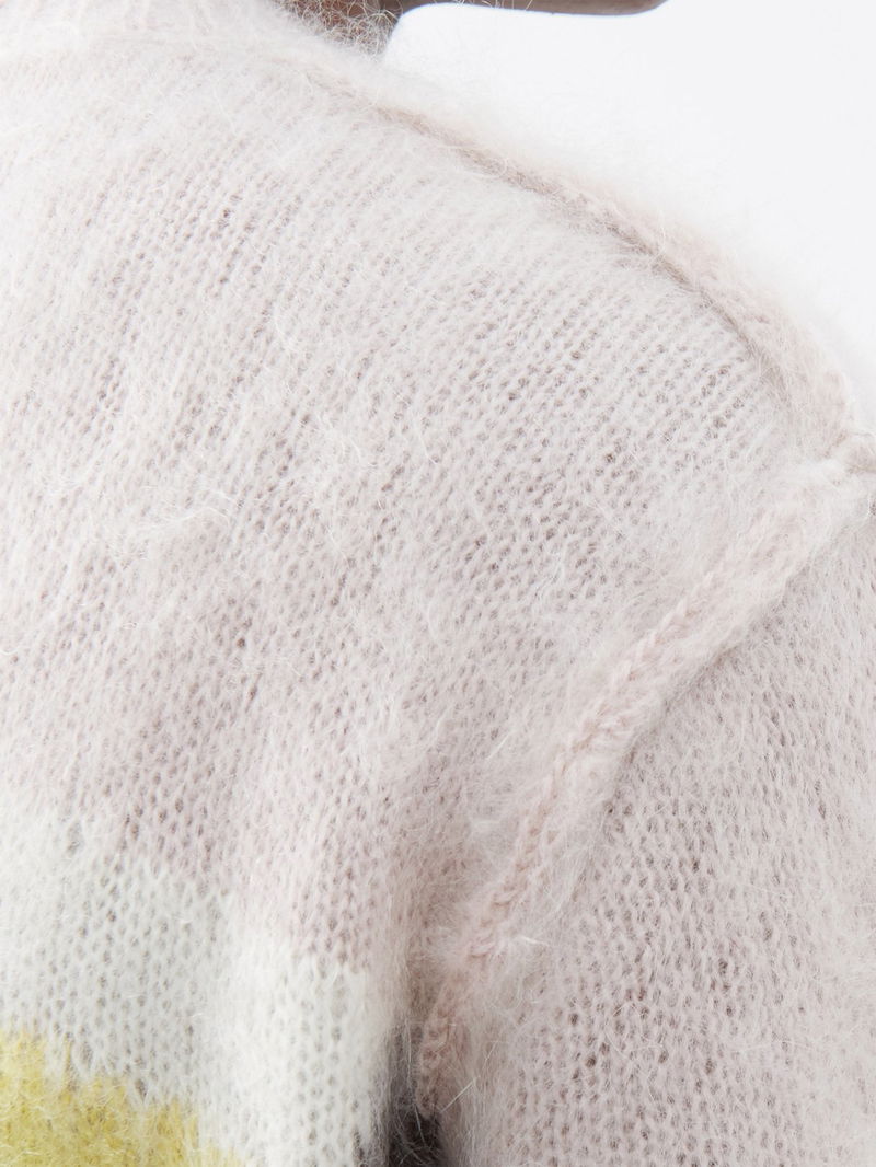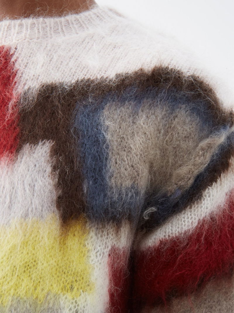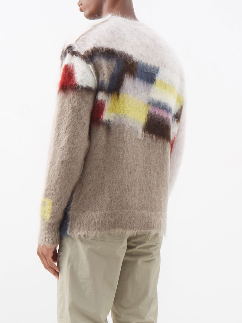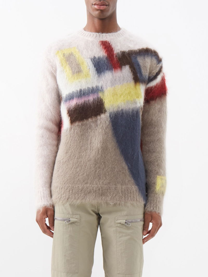 Fendi's brown sweater is knitted from brushed wool for a tactile feel with an abstract intarsia that recalls the Baguette bag of the AW01 collection.