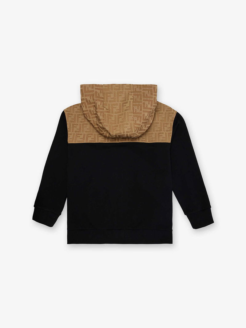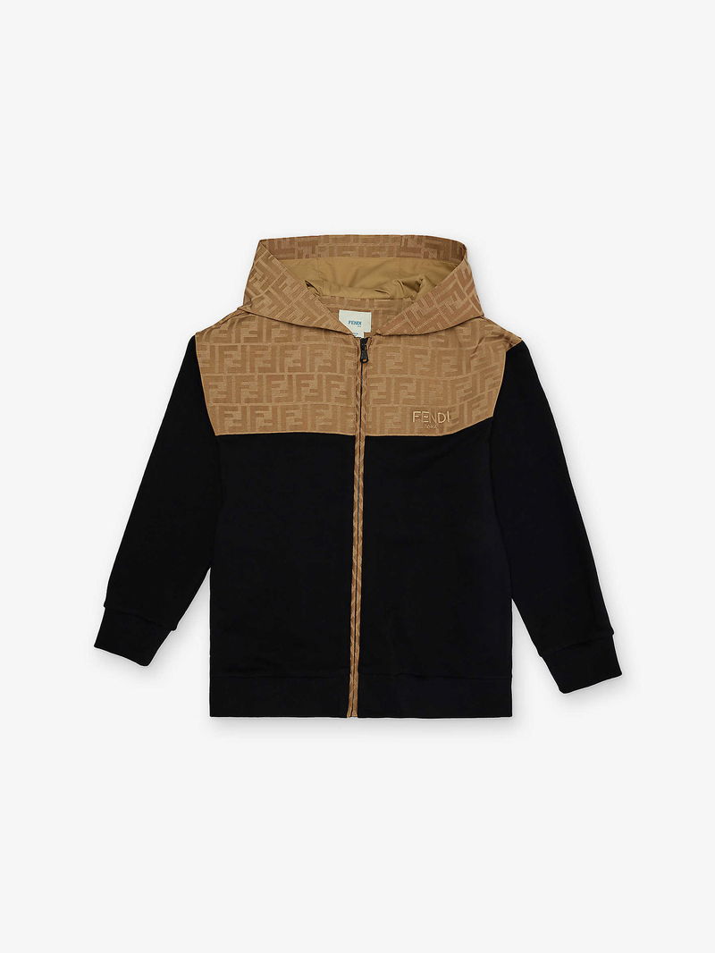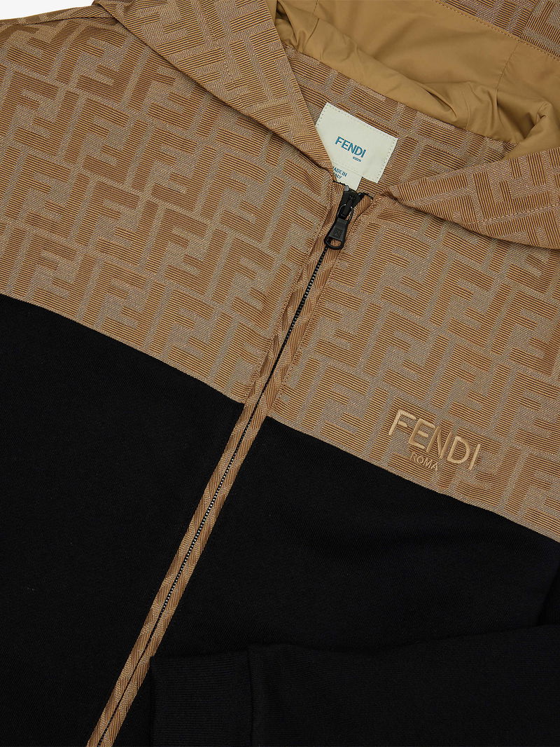 Fendi cotton-jersey and canvas hoodie. Regular fit, hood, long sleeves, brand embroidery, logo-print canvas panel, ribbed trims.