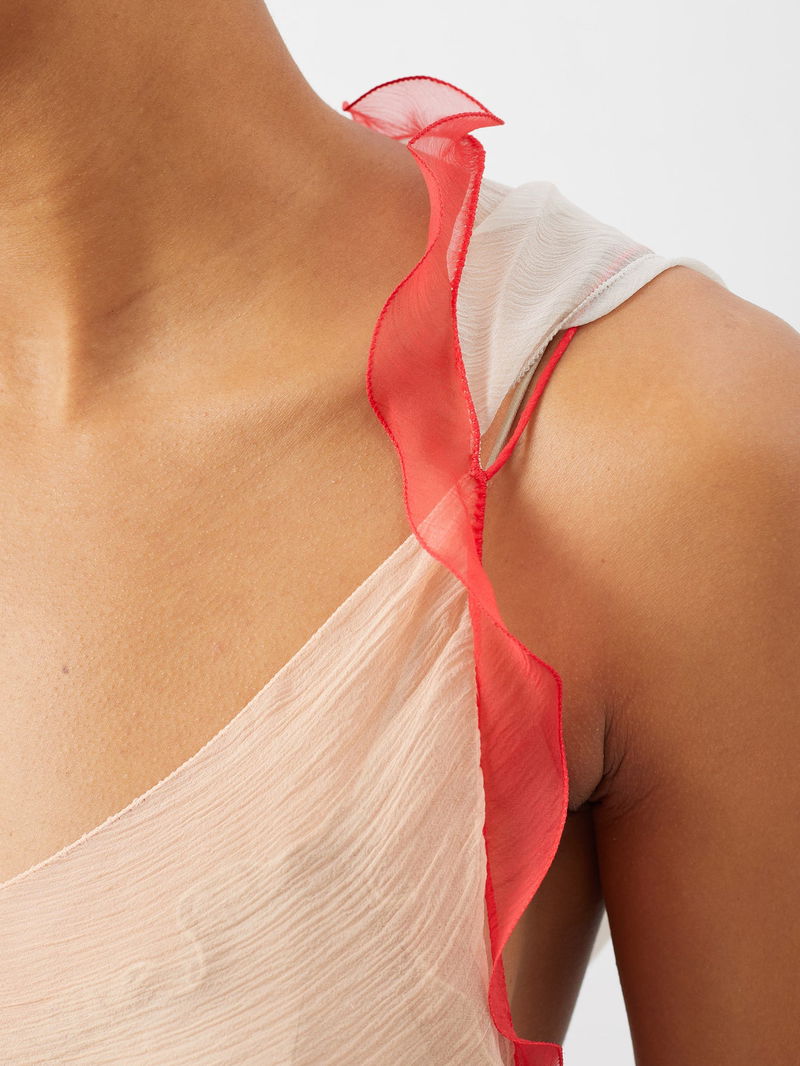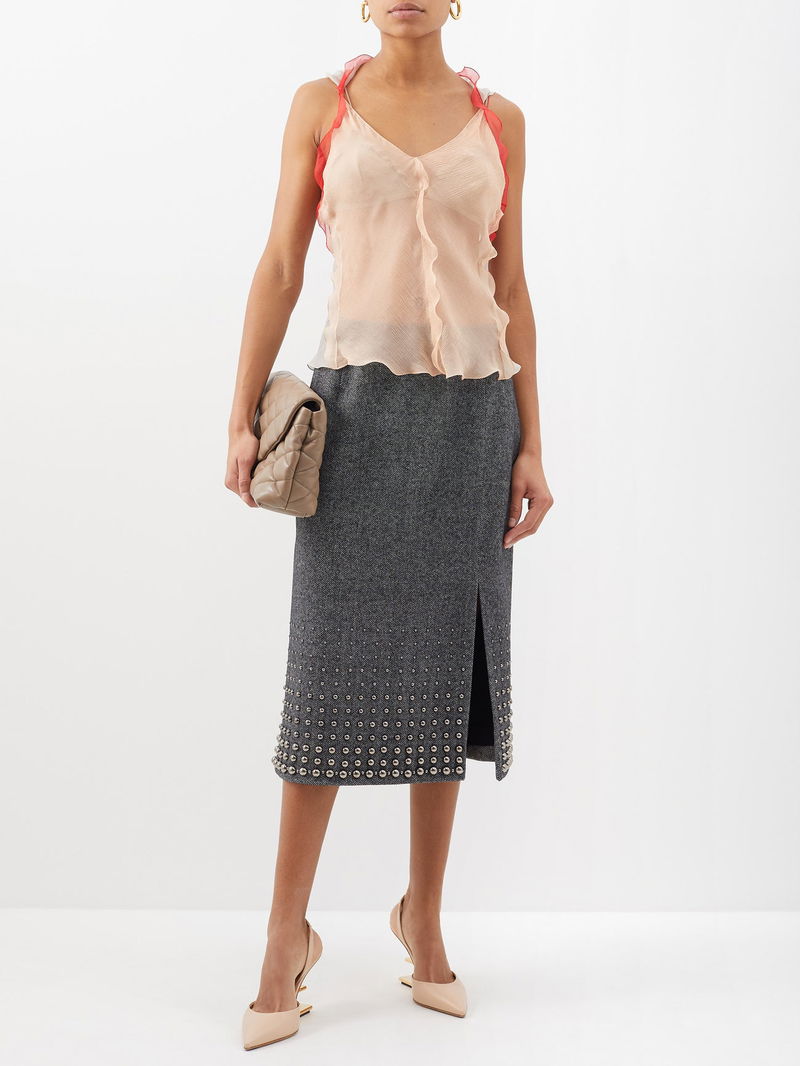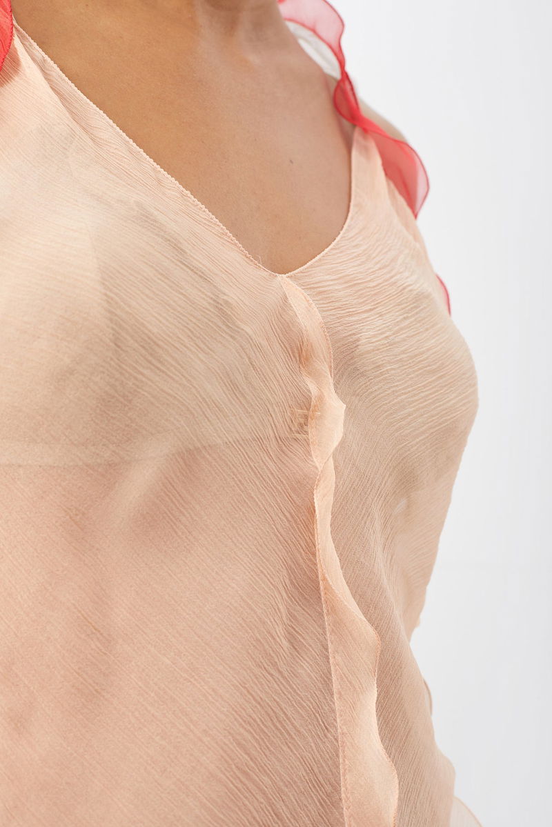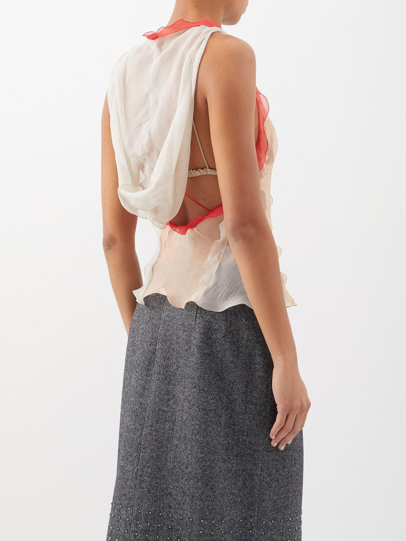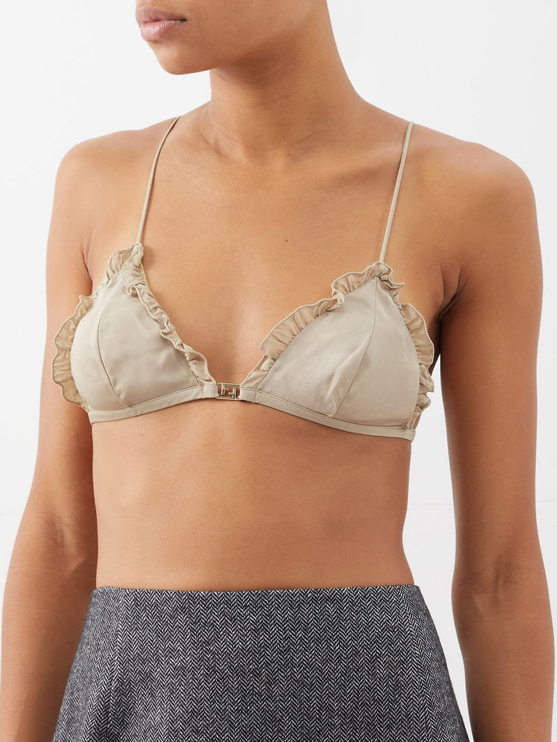 Opt for understated elegance with Fendi’s beige top and accompanying bra, which debuted on the AW22 runway and is crafted from wispy silk chiffon with a V-neckline and frilled trim