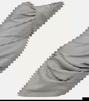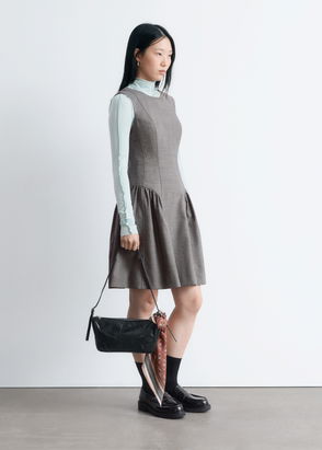 High neck mini dress with open front pleat detail. Back keyhole opening with zip closure. Falls at mid thigh.