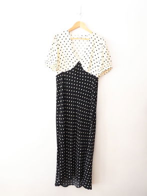 Inky stripes print. Printed shift dress with concealed placket. Button detail at neck. Falls at mid-calf. Light weight woven fabric.