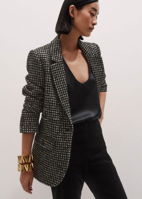 Wrap top with lapels and front button detail. Inside button fastening. Skims body for a tailored look. Can be worn alone or layered as a jacket. Medium weight woven fabric, printed finish.