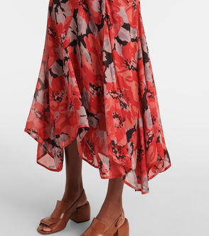 Brushed houndstooth border print. Pleated dress with front keyhole opening. Back zip closure. Falls at mid calf.