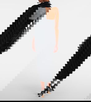 Dashed dot print. Pleated dress with front keyhole opening. Back zip closure. Falls at mid calf. Light weight printed georgette fabric.