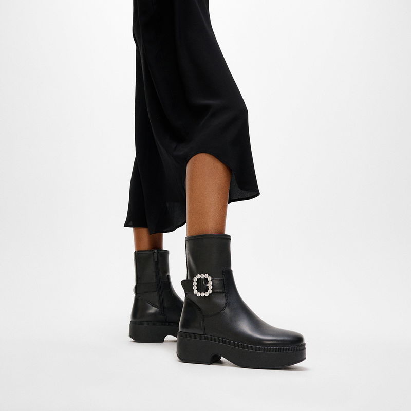 F-LUMA Crystal-Buckle Leather Short Boots Leather/Pu