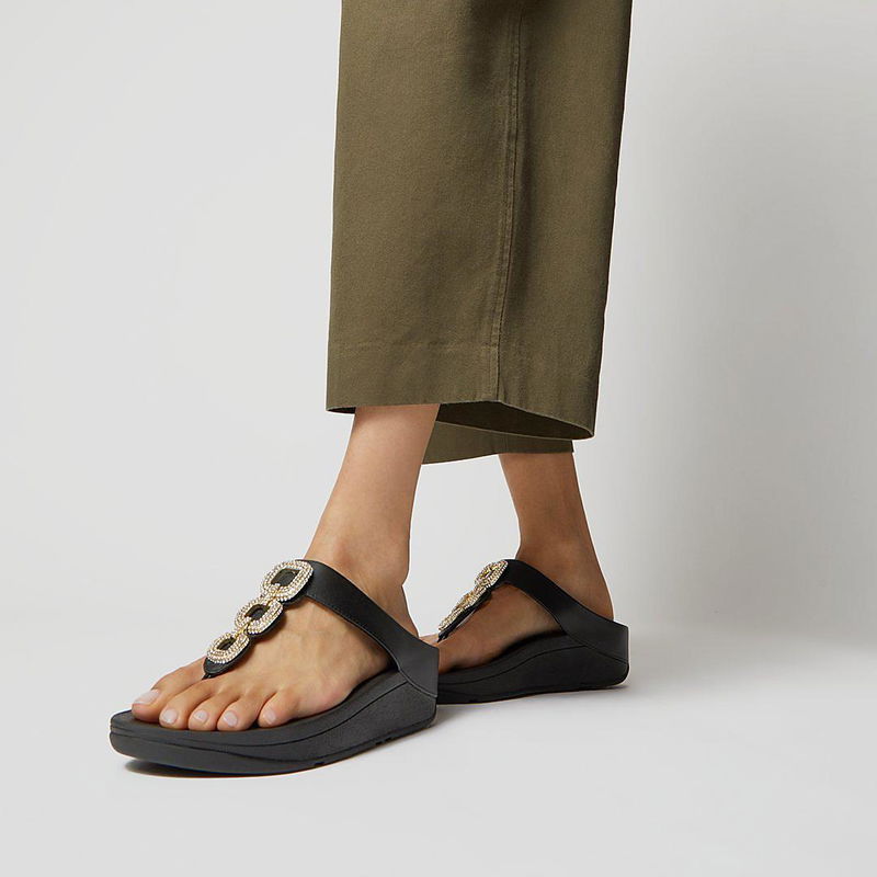 FINO Crystal-Chain Leather Toe-Post Sandals