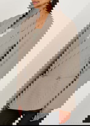 This double-breasted blazer is modernised with a collarless neckline, split cuffs, and a fitted silhouette through the waist.