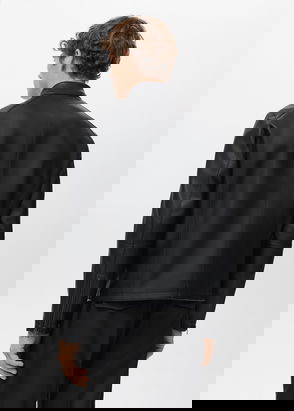 A boxy, short jacket block with shirt collar and pleated back detailing Metal snap stud closure at centre front and cuffs. Patch pockets and back panel with pleats.