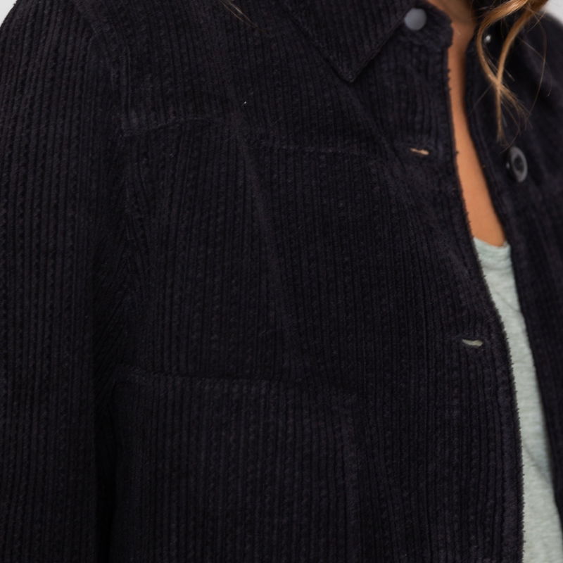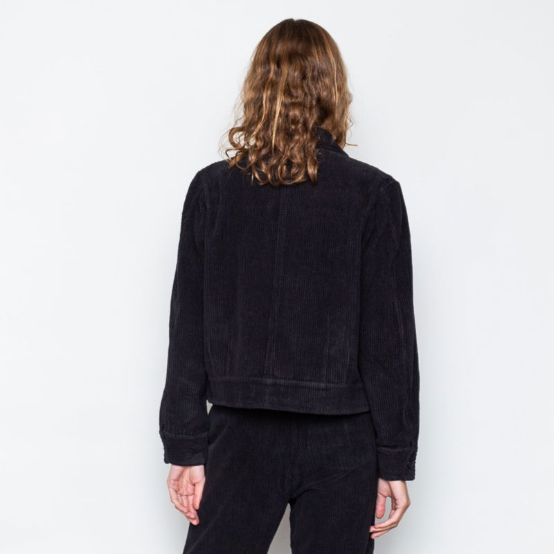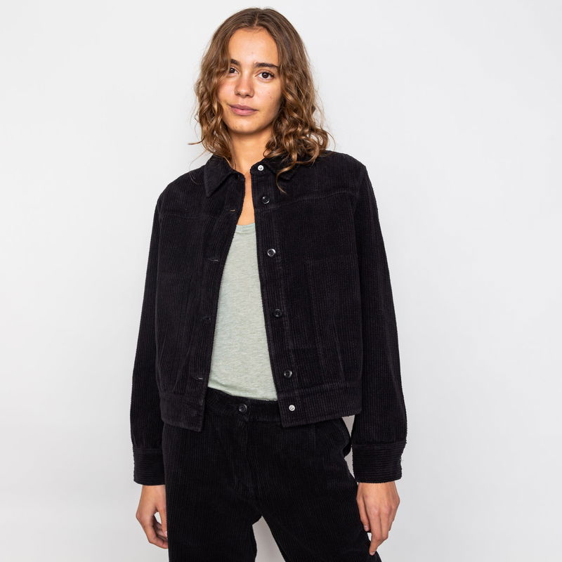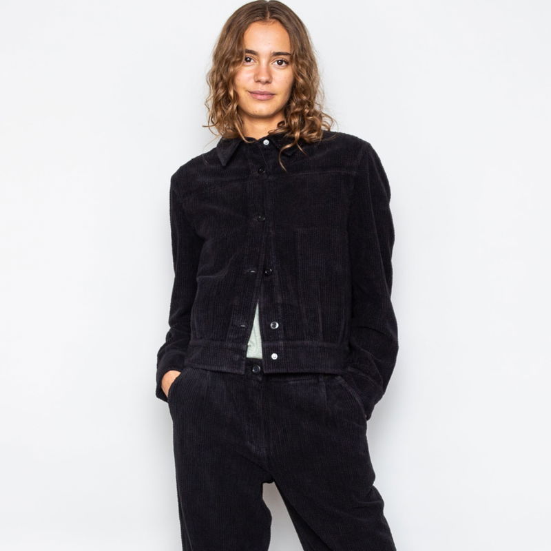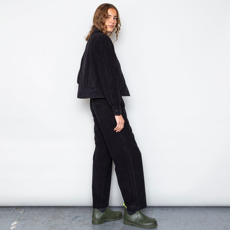 Utilitarian inspired cropped jacket. Oversized collar shape. Banana sleeve silhouette. Front button placket and snaps on collar, cuffs and concealed at hem. Large square patch pockets. Double internal chest pockets.