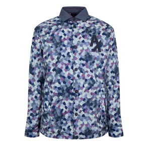 The Wadded Contour Jacket is a short, casual bomber style. It features a rib bomber collar and a double ended metal zip closure which is covered by a placket with metal snaps in gunmetal finish. The main body is in a black featherweight nylon fabric from Korea that has a slightly powdery, sporty surface finish, and the body is lightly wadded, with irregular quilt stitching lines running horizontally across. The sleeves are in a contrast quality fabric, which is a water repellent cotton nylon fabric from Japan that is a slightly deeper tone of black.