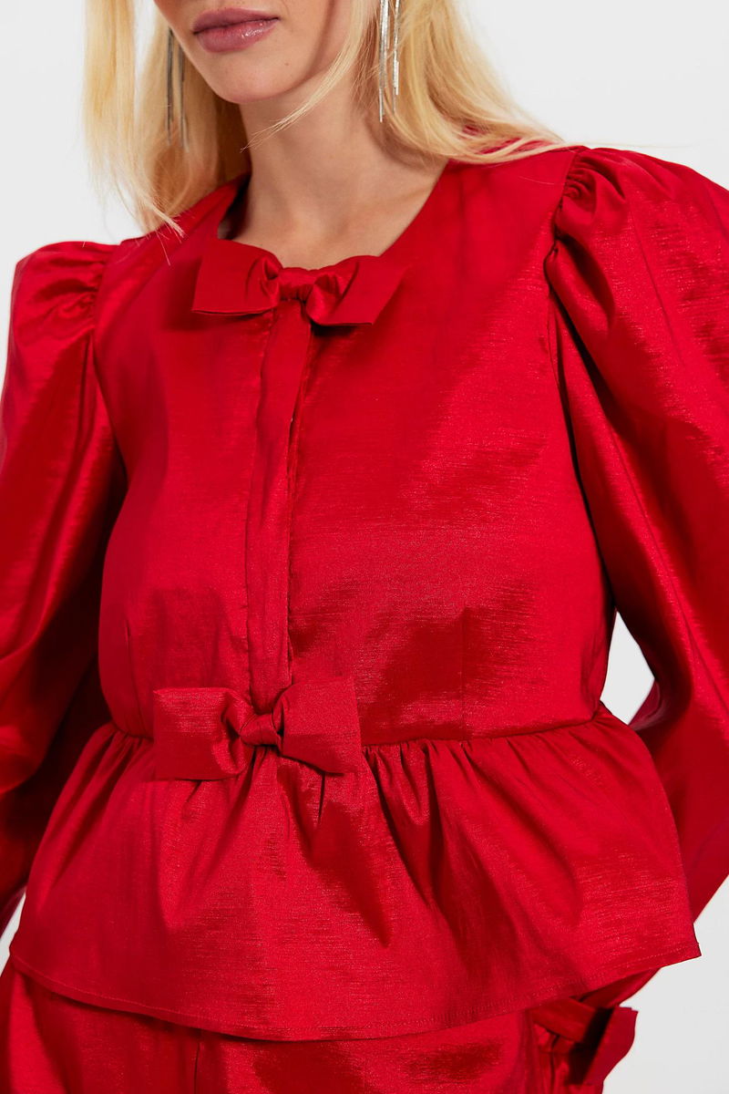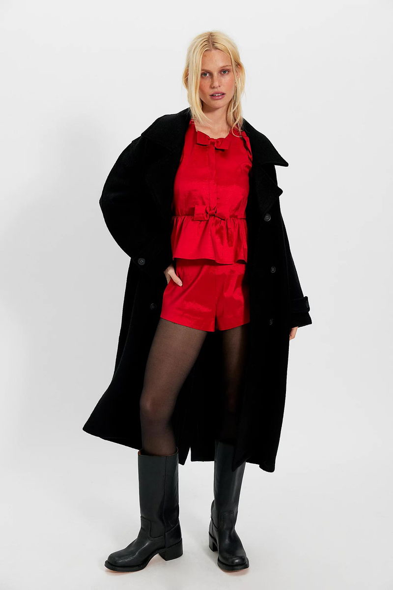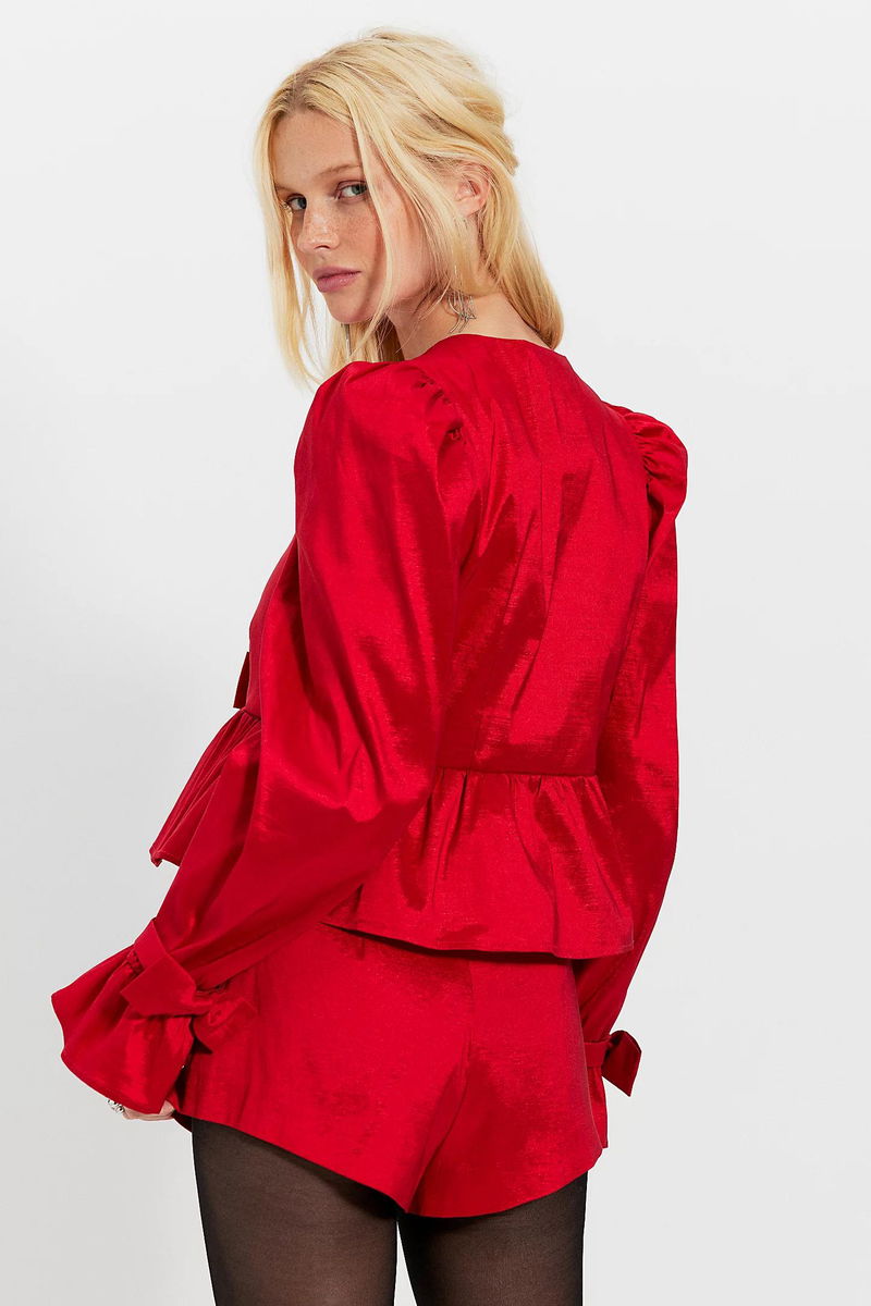 You’re the present in this set from For Love and Lemons, featuring a peplum-adorned puff-sleeve top and tailored high-rise micro shorts in a so-special taffeta fabrication for the perfect festive finish.
