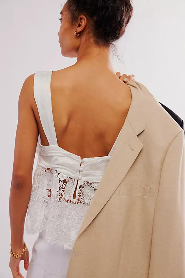 Embrace your soft side with this sheer top from For Love & Lemons, featured in a fly-away, open-front style with intricate rose lace piecing and a satin bust, complete with a tie-front detail, button-back accents, and bow appliques. Fitted at bust, flared bodice. Satiny bust, tie-front detail, sheer rose lace peplum, wide straps, button detailing at back, lace trim, bow appliques, scalloped hem. Pair with black capris and ballet flats for a romantic look.