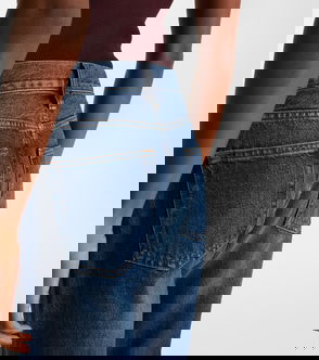 Non-stretch regenerative cotton denim jeans. Fading, whiskering, and subtle distressing throughout.