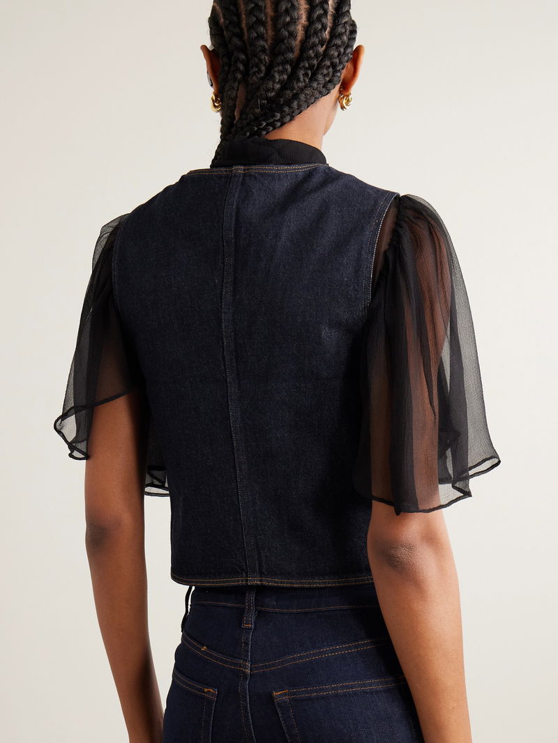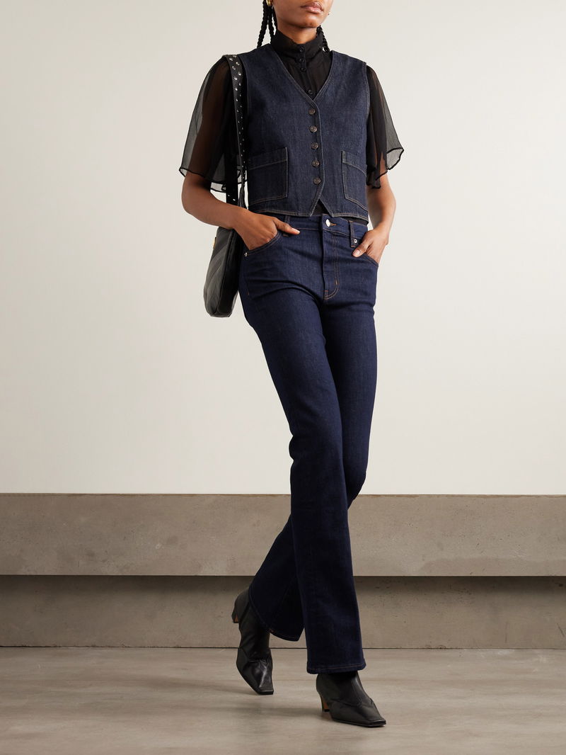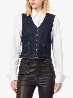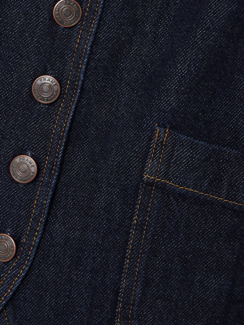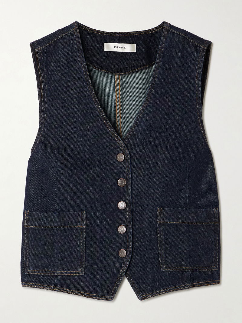FRAME's vest is cut from the brand's signature rigid denim that offers gentle structure. Dyed in an inky dark-blue shade it has a V-neckline and patch pockets at the front. Wear it solo or layered.