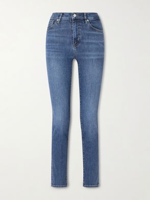 Skinny jeans, Faded, Denim, Belt loops, High-rise cut, Five pockets, Button and concealed zip fastening at front, Unfinished cuffs, Mid-weight, stretchy fabric.