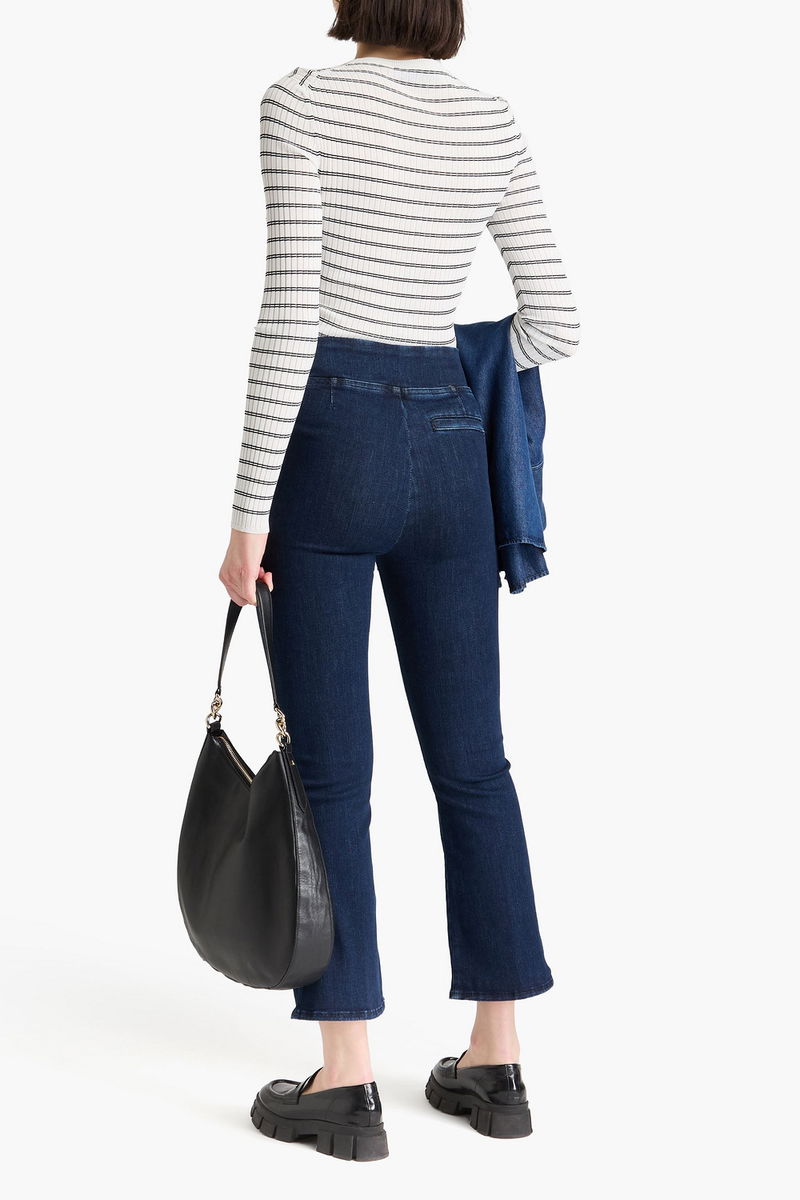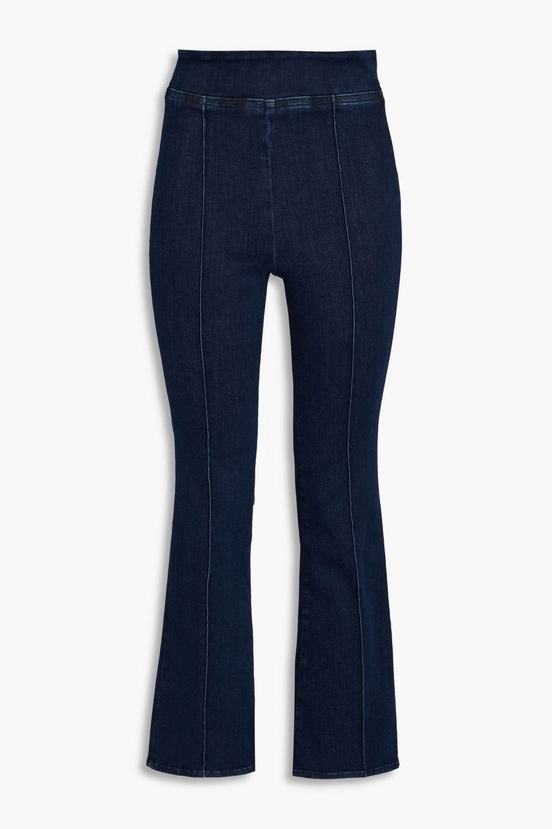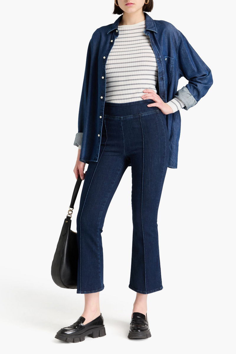 Bootcut jeans, Denim, Stitched front creases, Cropped, High-rise cut, Pull on, Mid-weight, stretchy fabric.