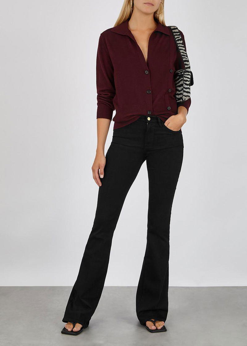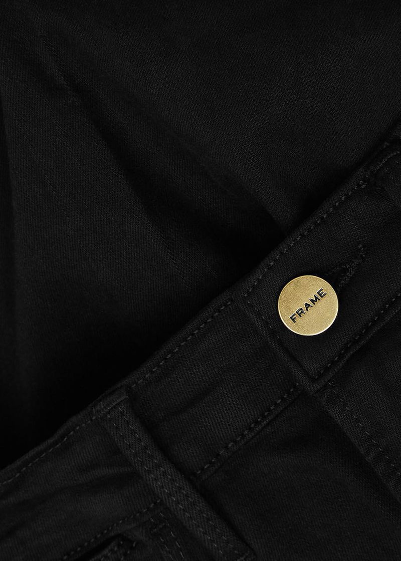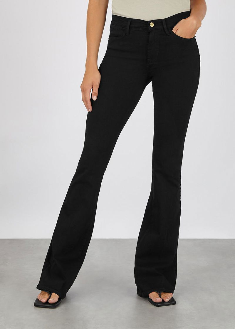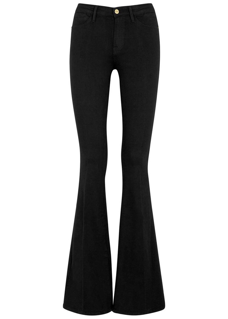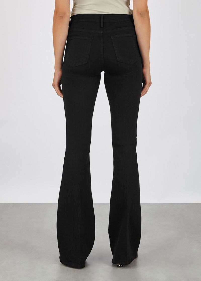 Frame Denim black stretch-denim jeans. High-rise fit flared-leg cut belt loops five pockets. Concealed zip and button fastening at front.