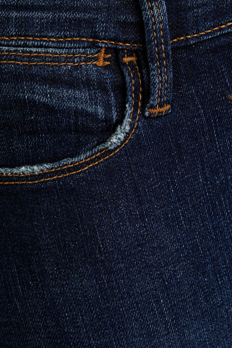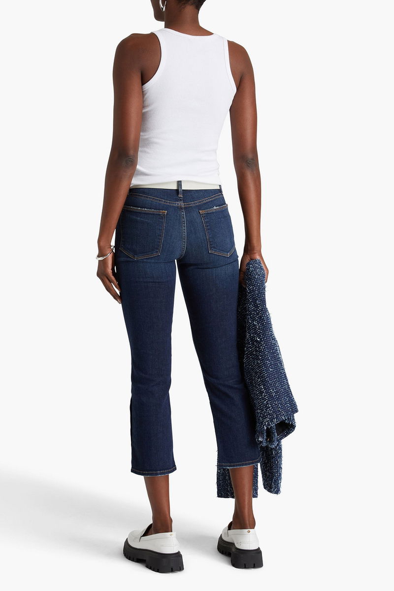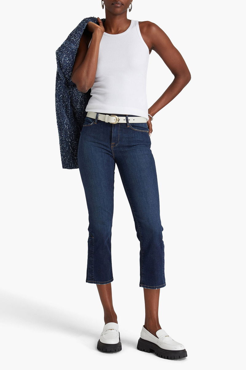 Straight-leg jeans, Faded, Denim, Cropped, High-rise cut, Multipockets, Button and concealed zip fastening at front, Snap-fastening cuffs.