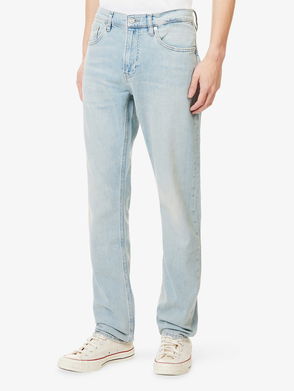 Frame stretch-denim jeans. Mid-rise fit, straight-leg cut, belt loops, five pockets, contrast stitching, designer engraved stud embellishments, whiskered, distressed and faded finish. Partially concealed button and zip fastenings at front.
