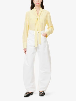 Frame creates iconic designs using fair manufacturing practices and sustainably sourced materials. The Sailor blouse is thoughtfully crafted from pure silk into a relaxed silhouette with smooth velvet trims and lightly puffed sheer sleeves.