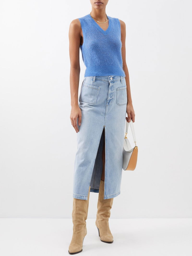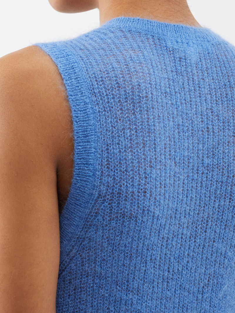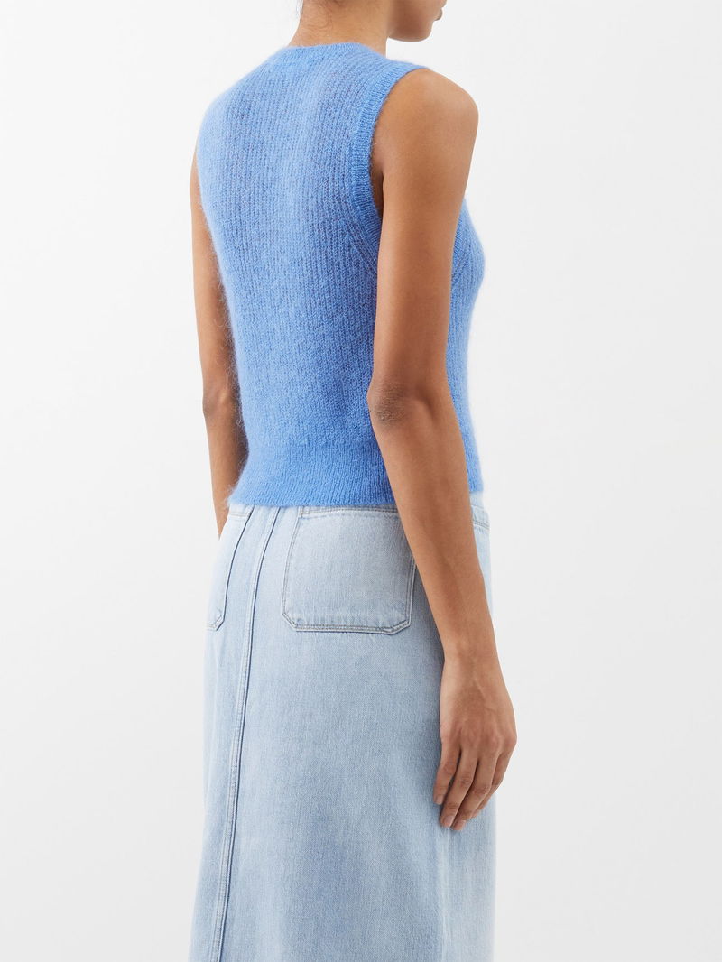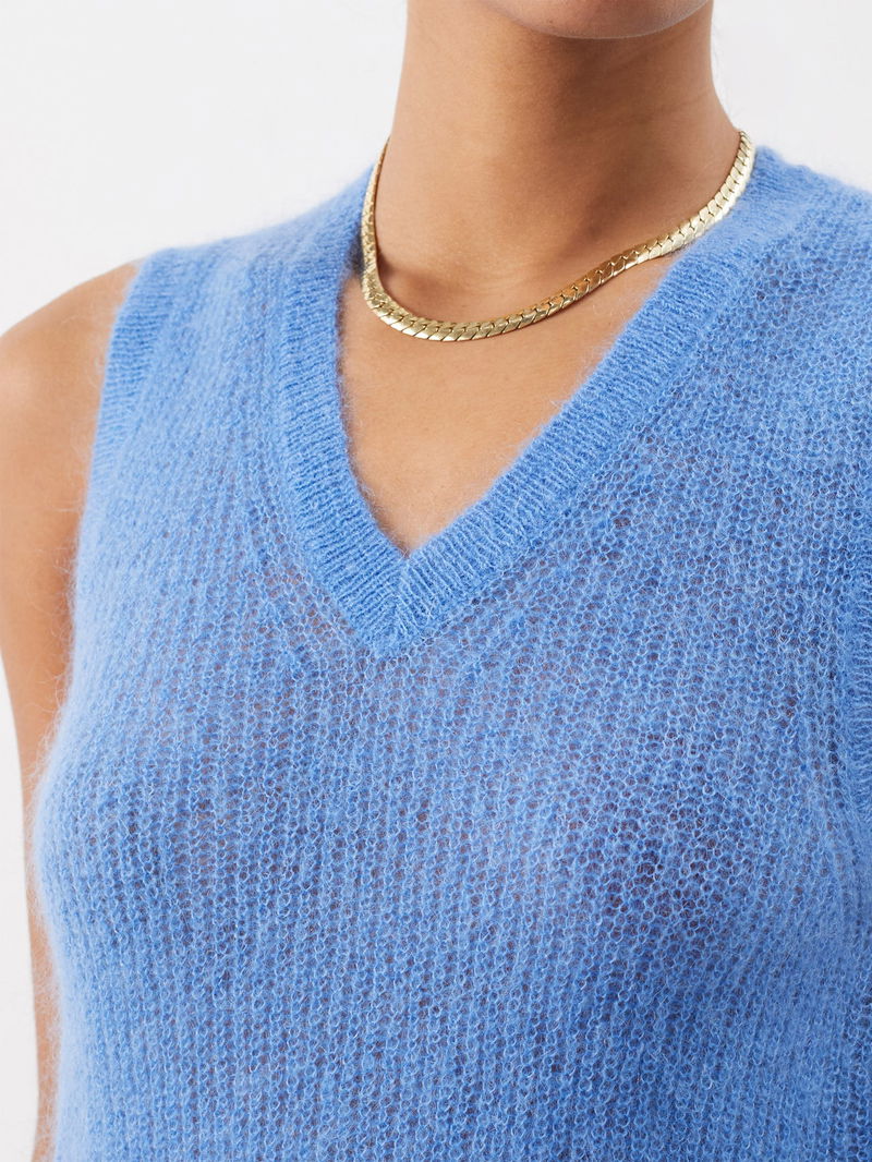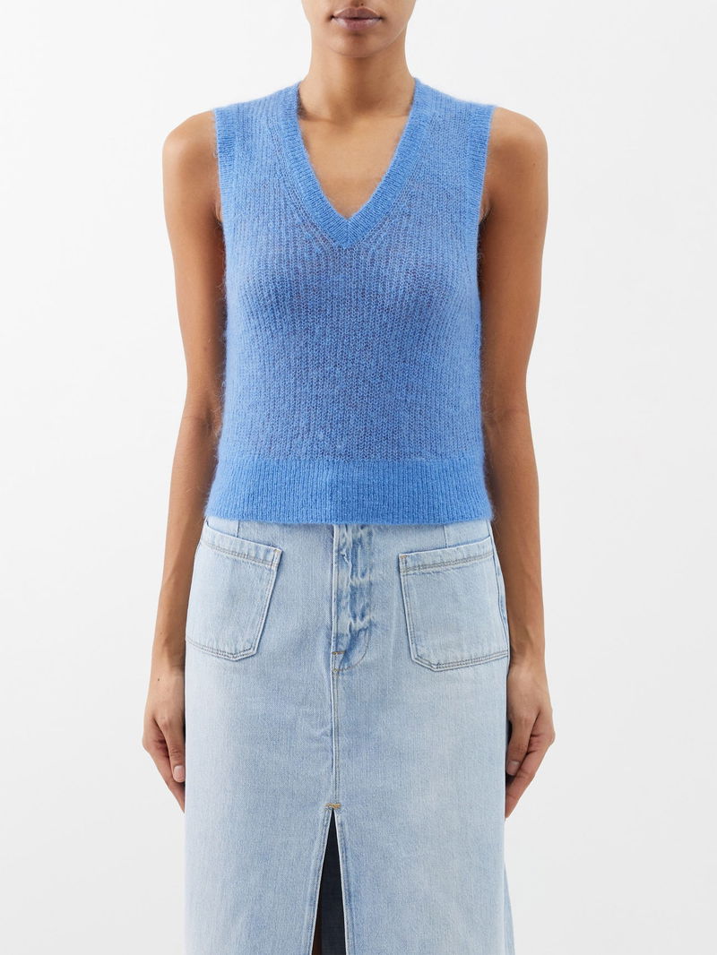 FRAME’s blue Shrunken sweater vest is crochet-knitted to a contemporary cropped hem with a ribbed V-neck and arm opening, exemplifying the label’s LA laid-back influences.