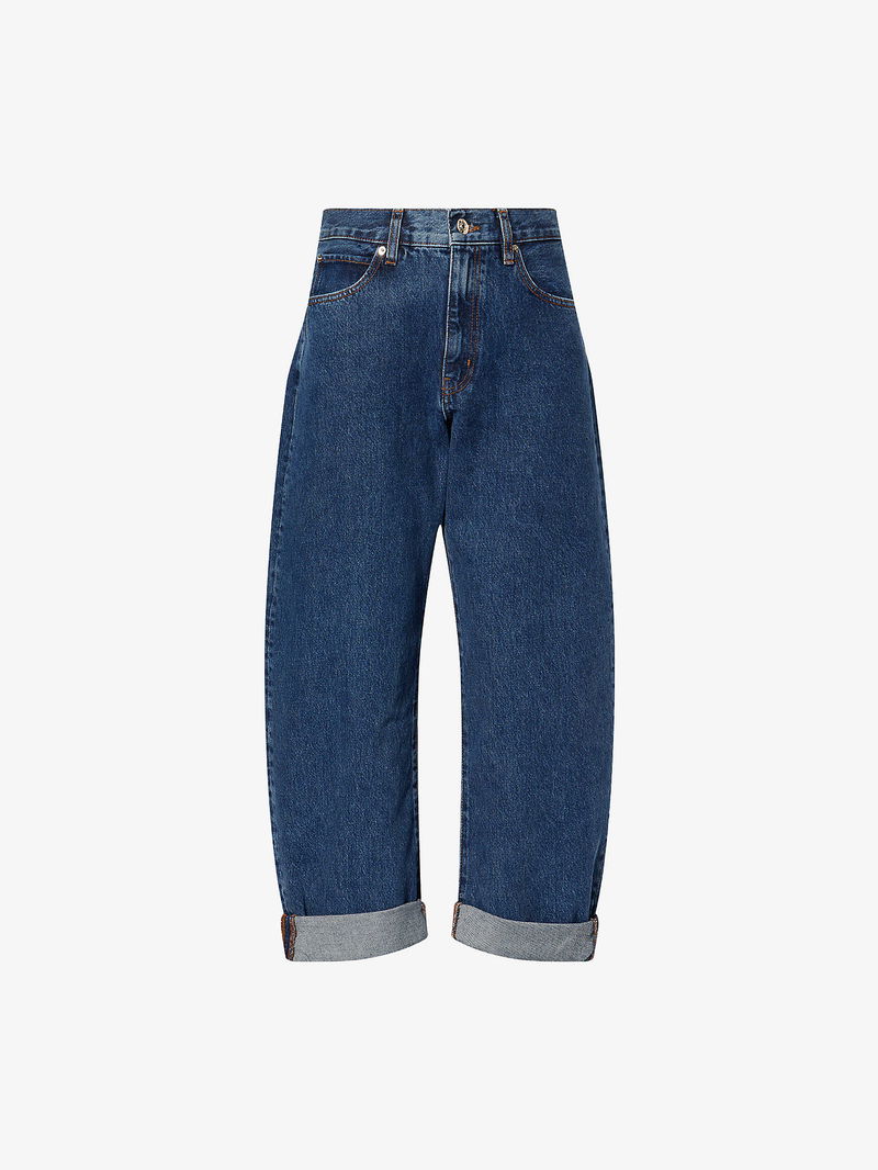 • Regular fit, high rise, curved leg, turn ups at ankle, five pockets, belt loops, branded hardware