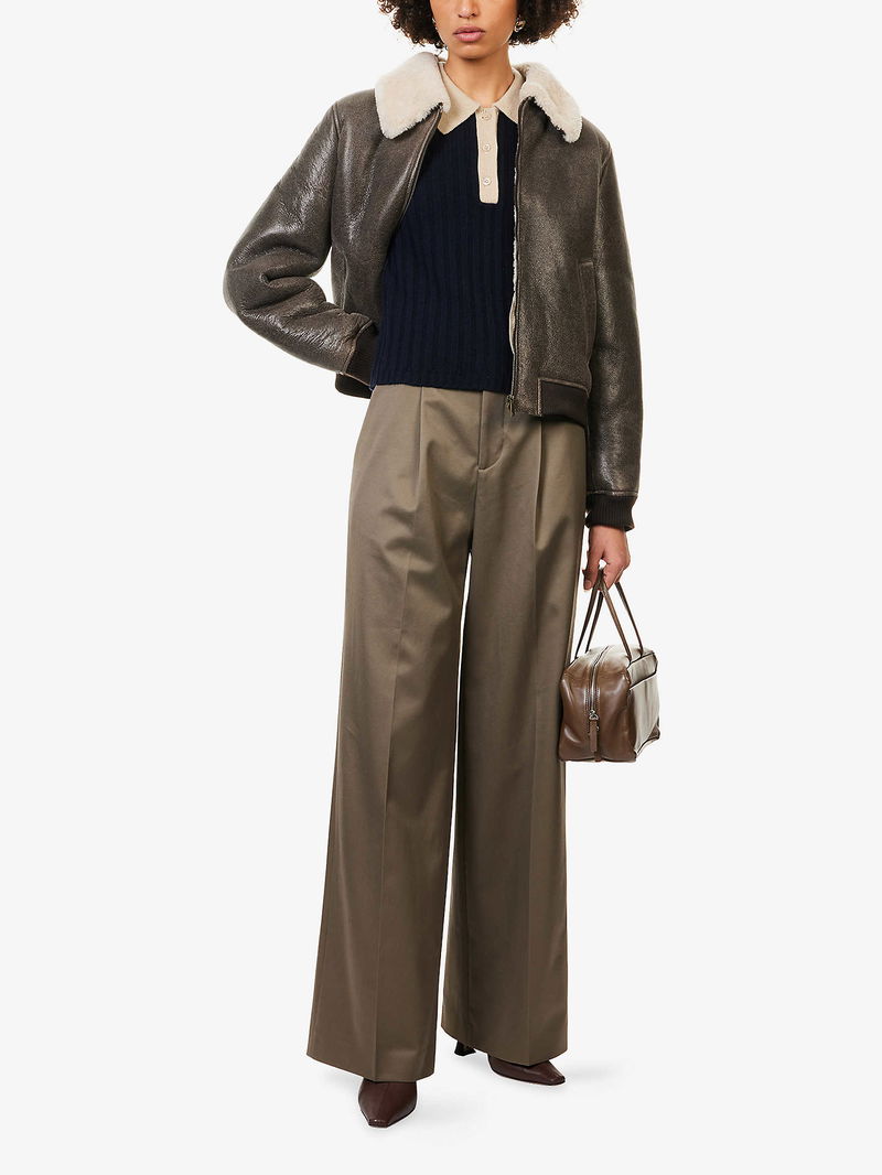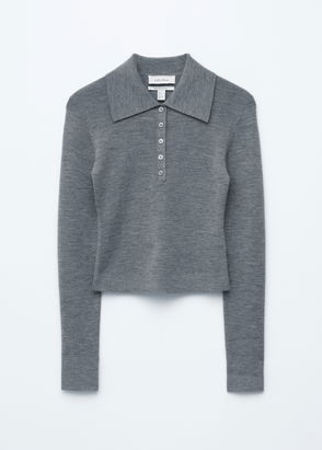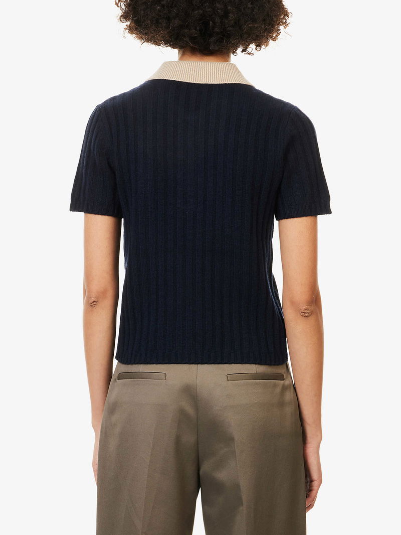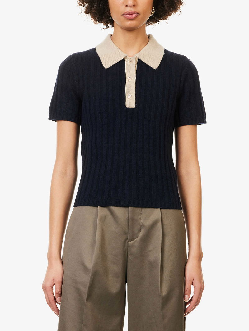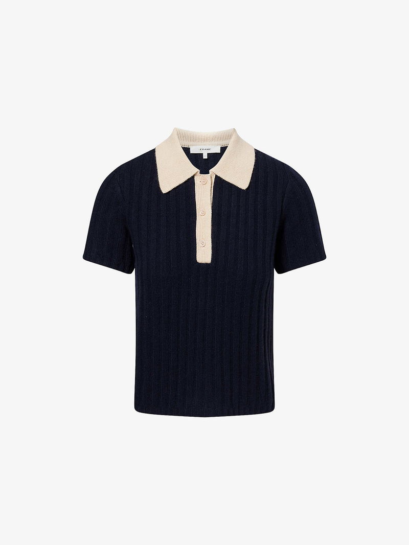 FRAME cashmere top. Exposed button fastening at front. Regular fit, contrast collar and button placket, short sleeves, all-over ribbed fabric, straight hem.