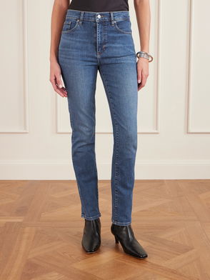 Frame's jeans are named for their 'Pencil' legs. They're cut from denim made with some recycled fibers, soft Lyocell and plenty of stretch and washed in a dark blue. Wear them with a soft tee and boots.