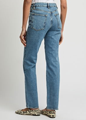 Slim-fit straight-leg stretch denim jeans. Fading and whiskering throughout. · High-rise · Belt loops· Five-pocket styling· Zip-fly· Logo-engraved silver-tone hardware· Contrast stitching in tan.